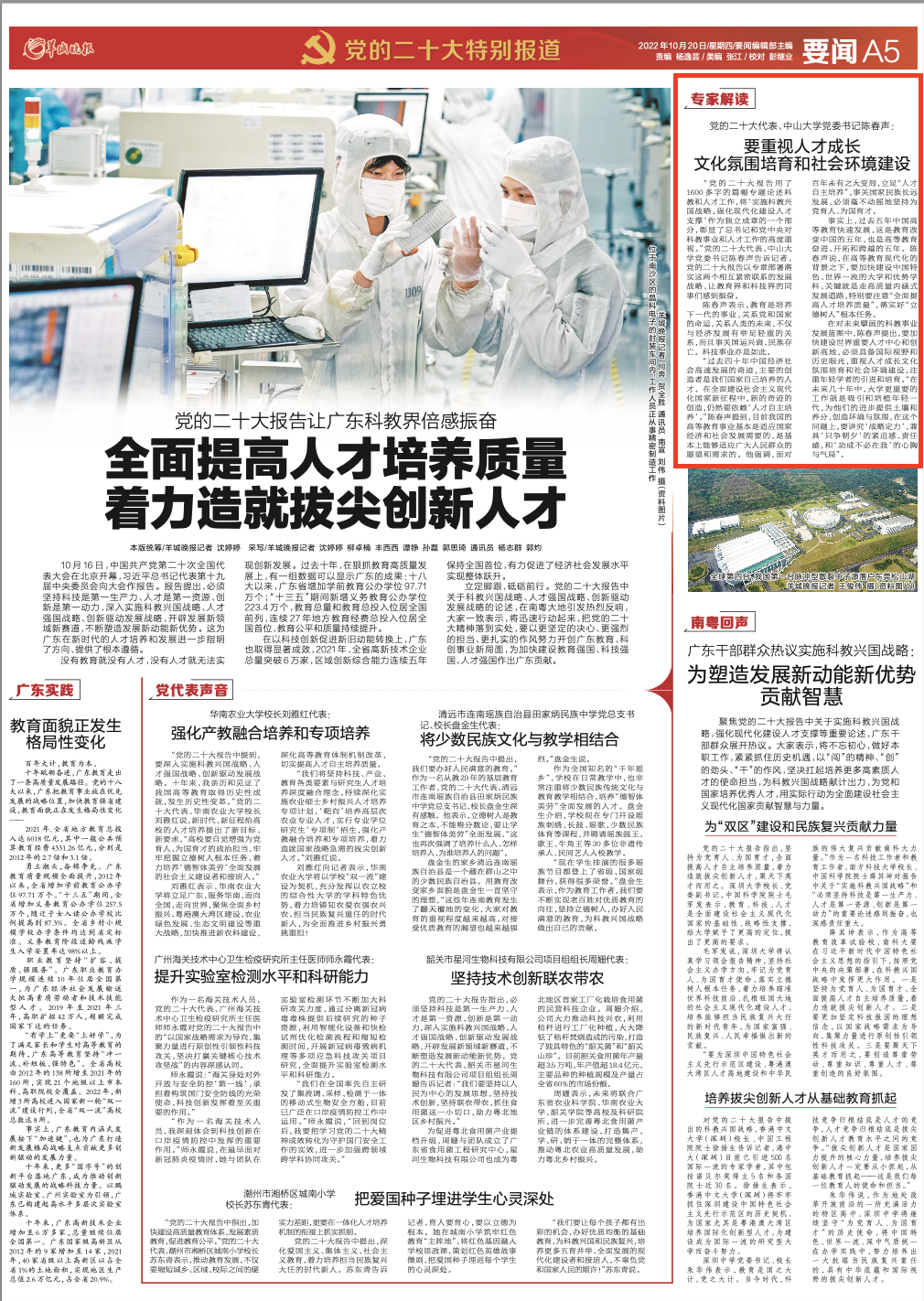 10月20日,羊城晚报A5版《党的二十大报告让广东科教界倍感振奋 全面提高人才培养质量 着力造就拔尖创新人》报道了党的二十大代表、中山大学党委书记陈春声。