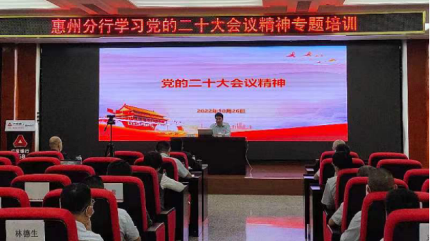 ▲ 惠州分行组织全体党员、入党积极分子和中层干部开展党的二十大会议精神专题培训,进一步深化党的理论知识学习,深刻领会党的二十大精神。