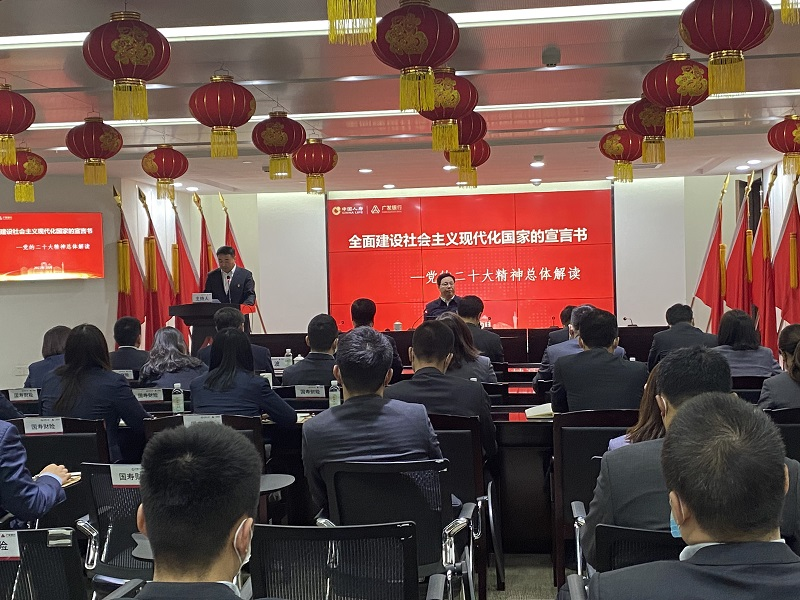 总行党委结合银行业实际,因地制宜研究制定《关于认真学习宣传贯彻党的二十大精神的通知》和工作方案,分阶段明确24项具体任务,抓好学习宣传贯彻工作;在“广学”平台设置党的二十大精神学习专栏,按要求组织党员参加银保监会及中国人寿集团宣讲会;各级党组织通过“三会一课”、主题党日、专题研讨、党员政治生日等多种形式开展学习活动,做到党组织全覆盖、党员全参与。