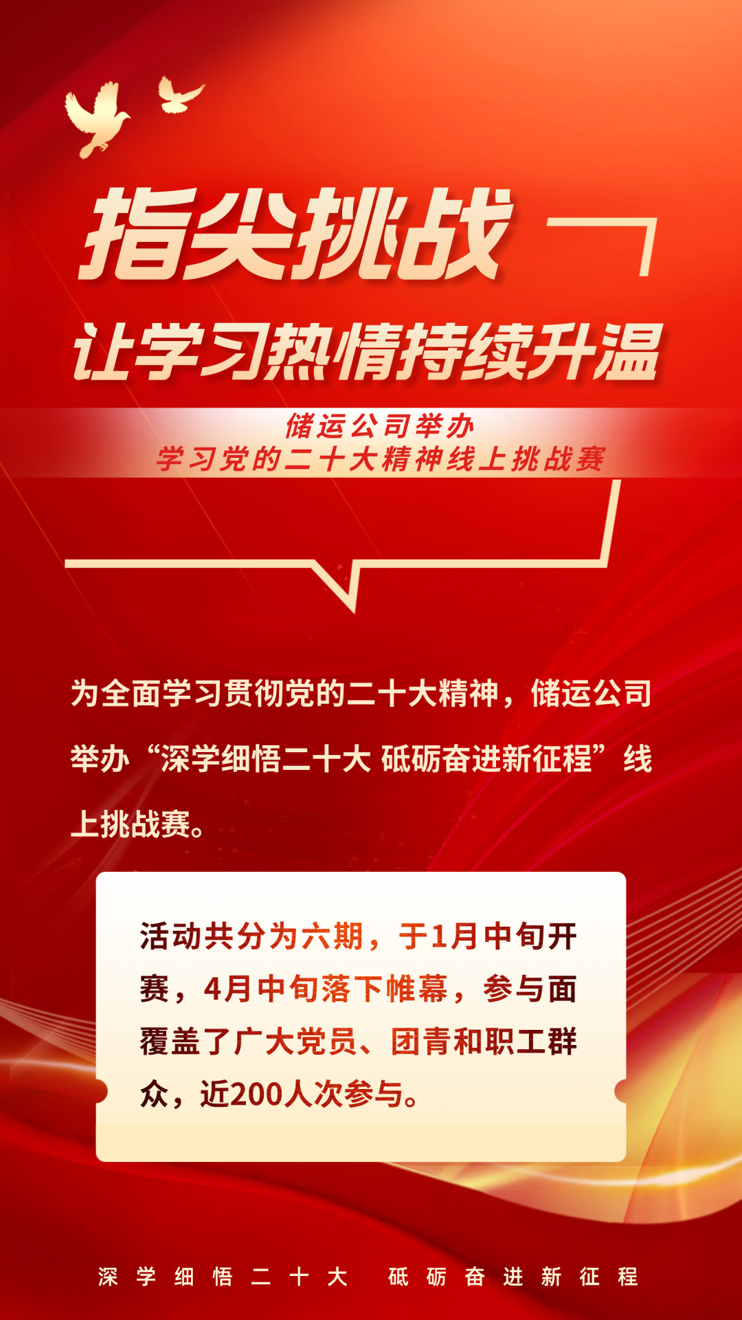 储运公司各党支部精心策划内容,积极组织动员,聚焦党的二十大报告和党章中的重点内容,用心挑选120个重要知识点作为题库,通过每期分解20题让参赛者逐步掌握领会,进一步增强了学习的针对性和有效性。为答题设置次数上限,避免突击学习,提升参赛者全面系统学的意识。