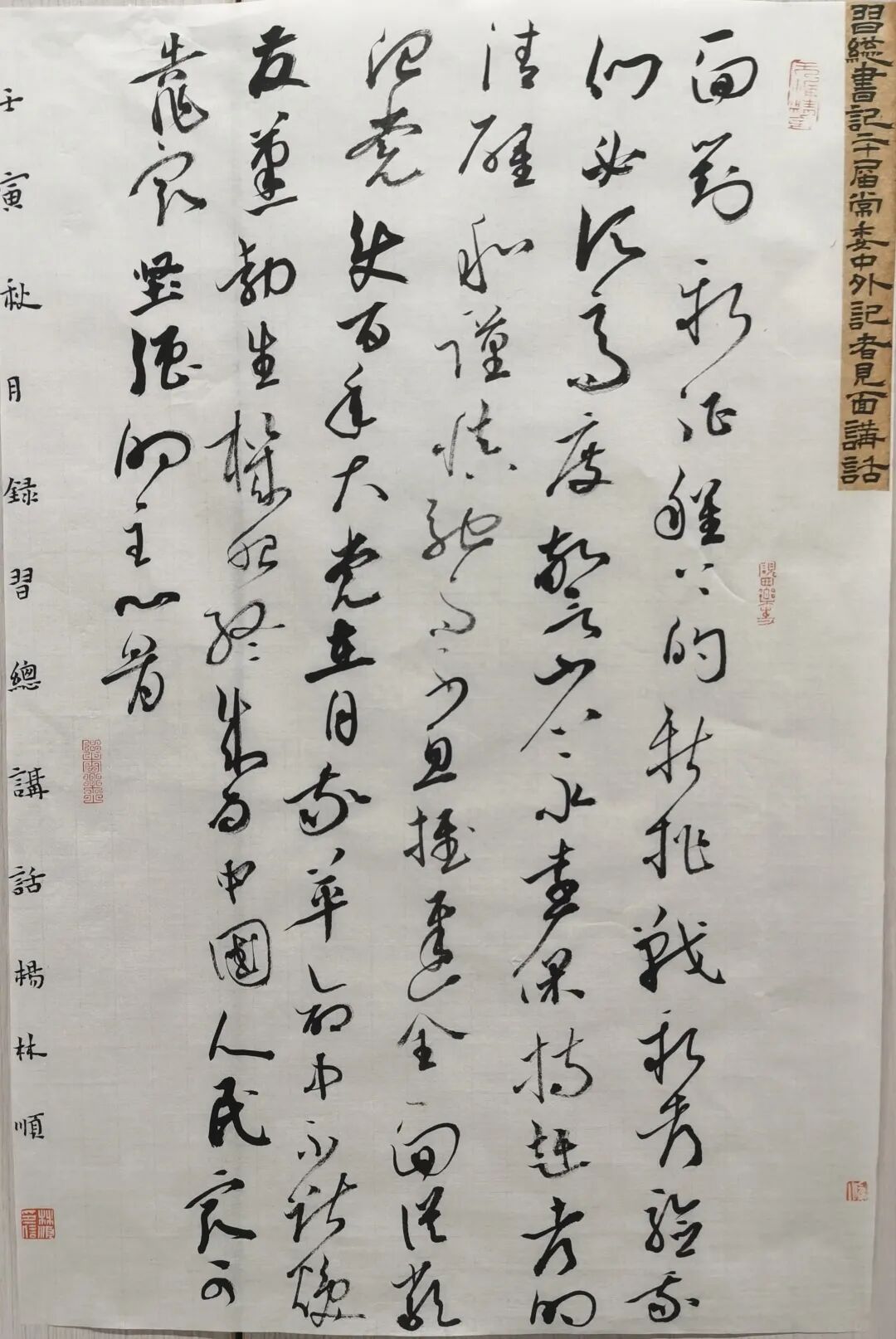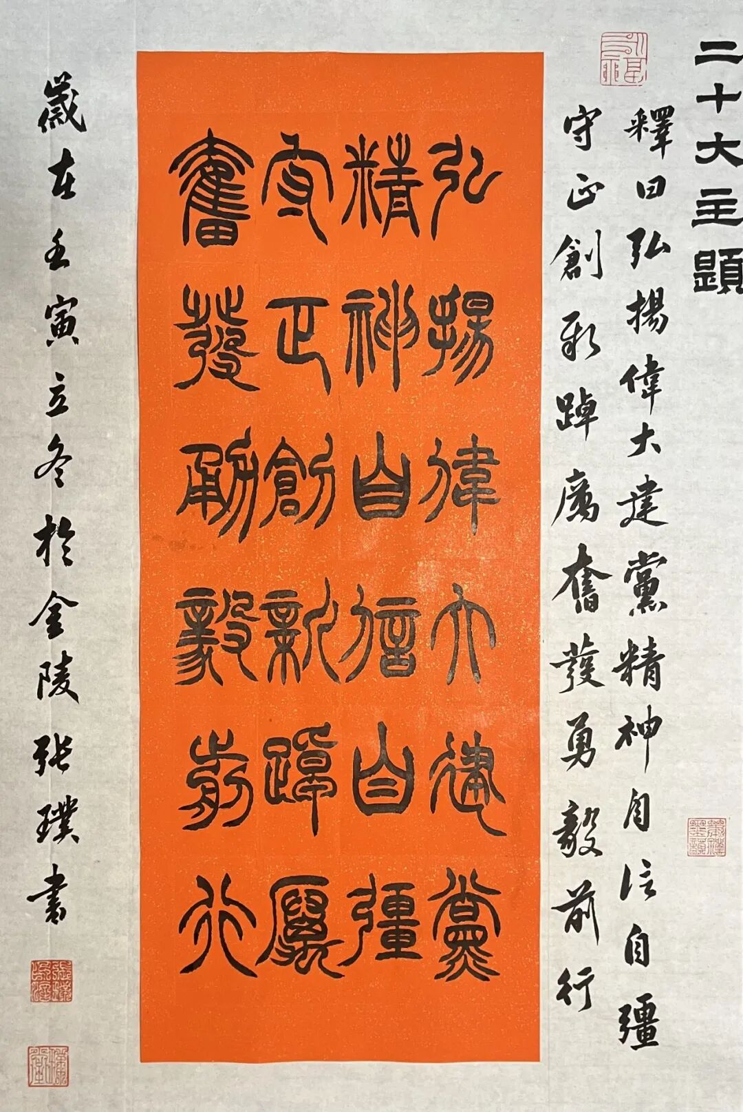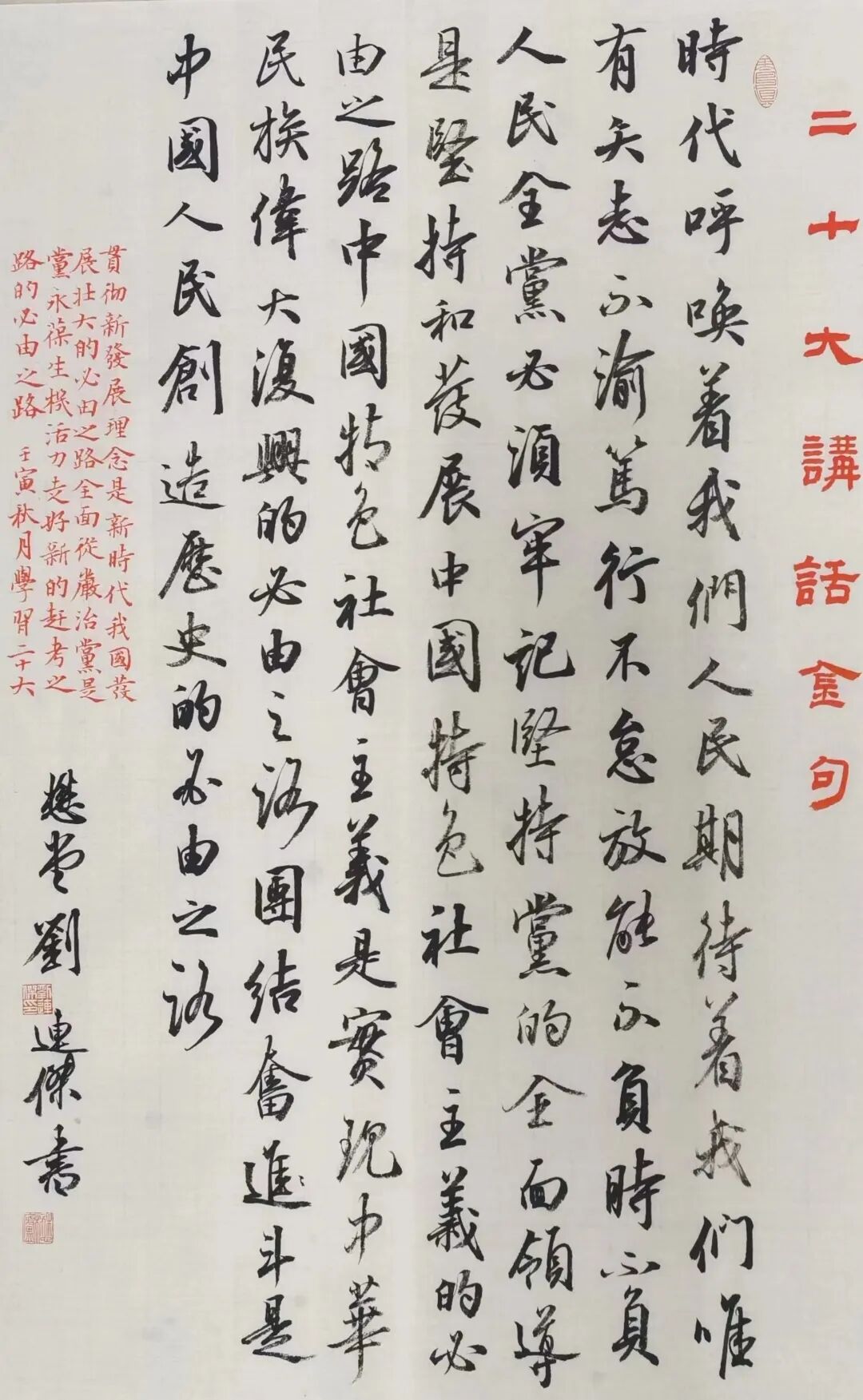 作品用行书书体创作“二十大”金句内容,兼杂朱墨隶书题署与小楷题记。以求达到两个方面之目的:第一,以期达到传播时代精神之意。第二,用展厅的场域功能,发挥书法作品美育教育的作用。