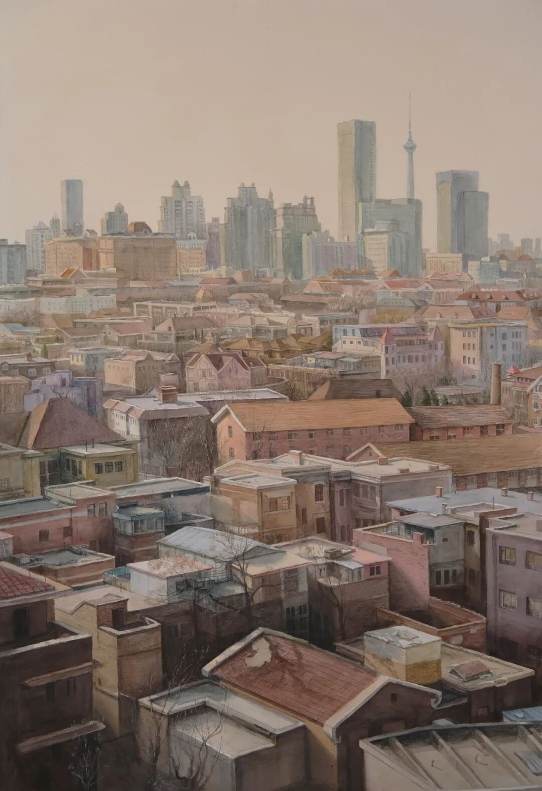 该画体现城市的变迁,从开始的小楼变为高楼大厦环绕,从变迁中感受到中国在变强变好。这是百年社会历史变迁的写照,也是宝贵的历史文化遗存。