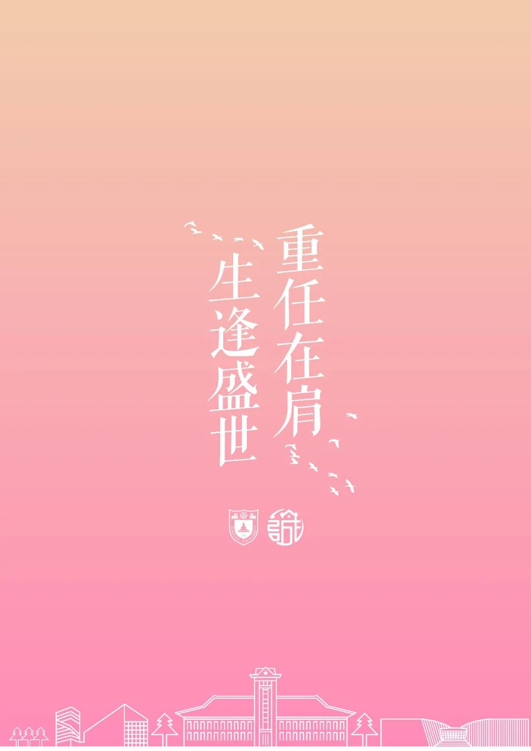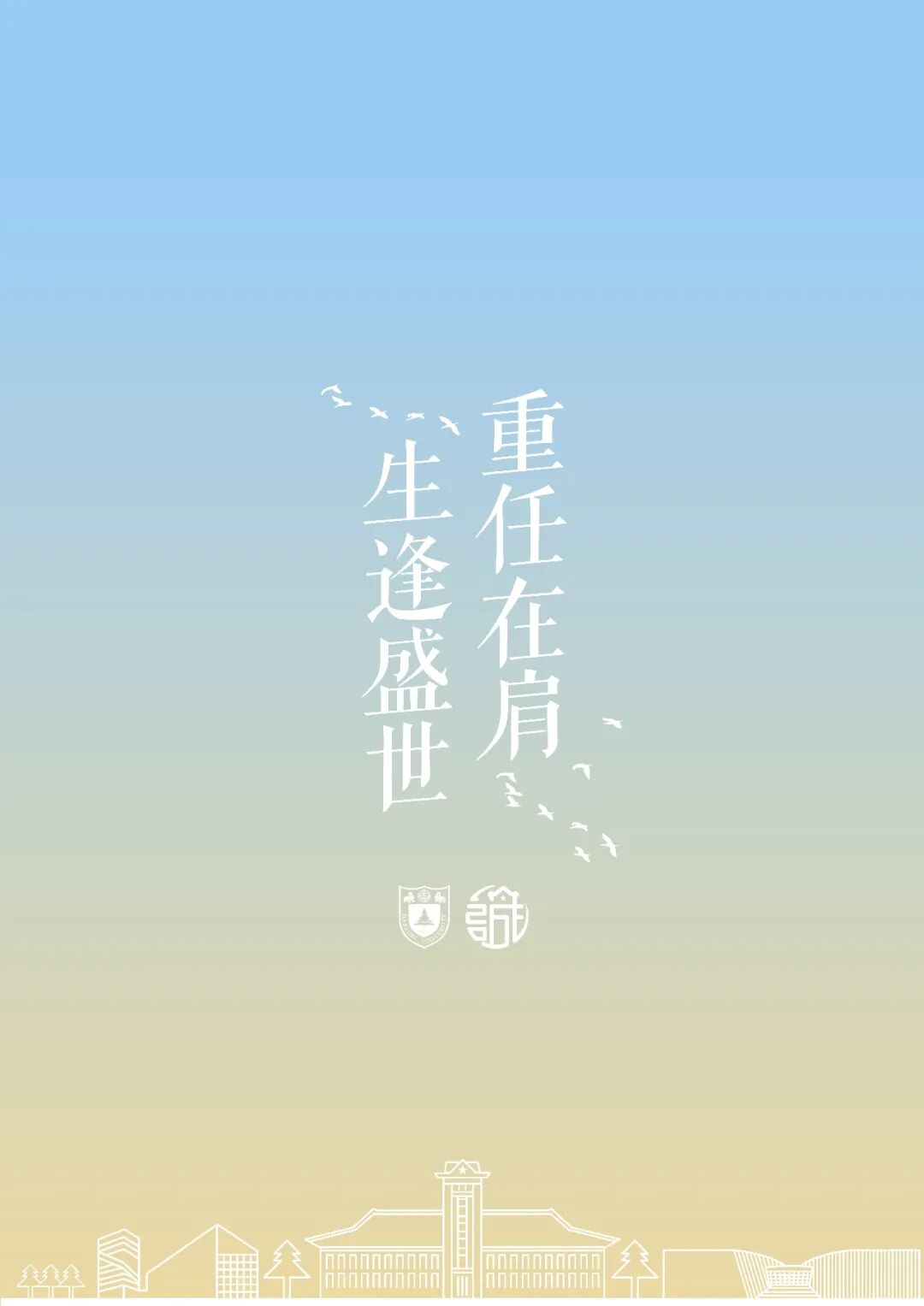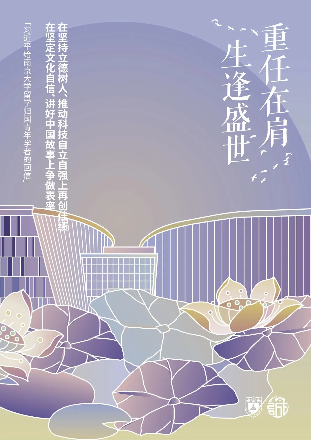 设计理念:信封底图的关键主体为南京大学北大楼,楼左侧是书本与松树元素的组合,灵感来源于右上角的校徽,右侧采用寓意坚韧不拔的梅花作为装饰点缀,目光上移可以看到画面两边相呼应的两个青年形象。在半圆形框架支撑之下,更多的元素得以呈现:左侧是象征现代化建设的南京地标紫峰大厦、地铁轨道与飞机,右侧则是代表文化积淀与传承的鸡鸣寺与城墙。综合来看,这寓意着现代化建设进程中青年人身上的时代使命与历史责任,意在呈现南大青年“勇担当,敢争先”的精神气质。