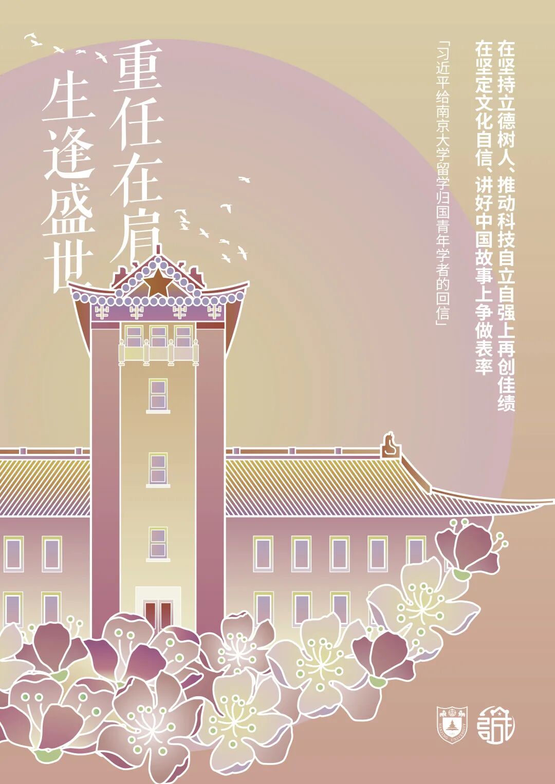 设计理念:两款文件夹均精选南大标志建筑物,结合花卉时景进行创作。意欲展示120周年校庆之际,南大百廿风华正茂,青年学子生逢盛世,心系“国家事”,肩扛“国家责”的青春面貌。以120周年校庆之际《习近平给南京大学留学归国青年学者的回信》中的两句为文案。展现南大学子切实践行总书记“为全面建设社会主义现代化国家、实现中华民族伟大复兴的中国梦积极贡献智慧和力量”期望的不懈努力。契合青年与伟大时代“同呼吸、共命运”,应以国家富强、人民幸福为己任的题中之义。
