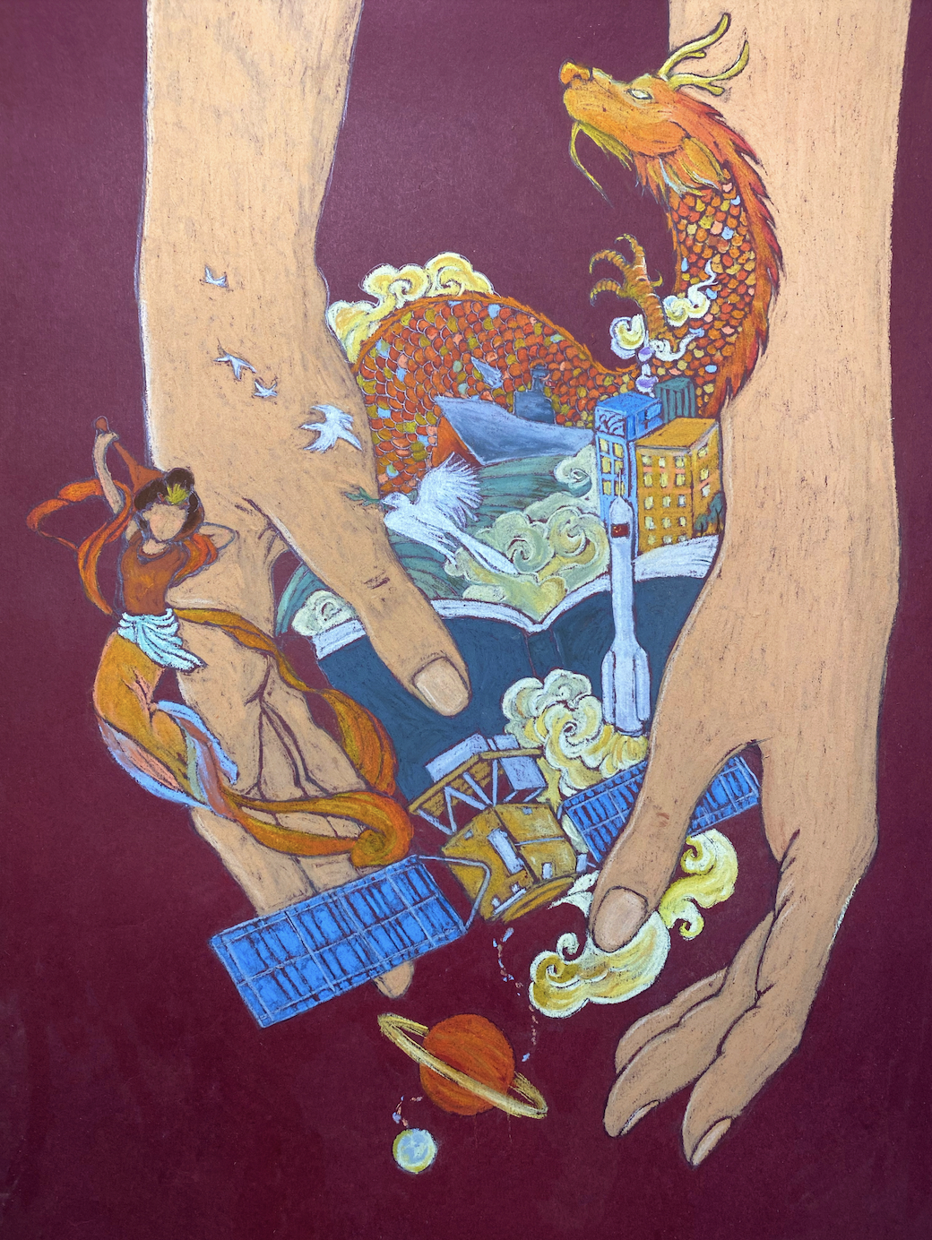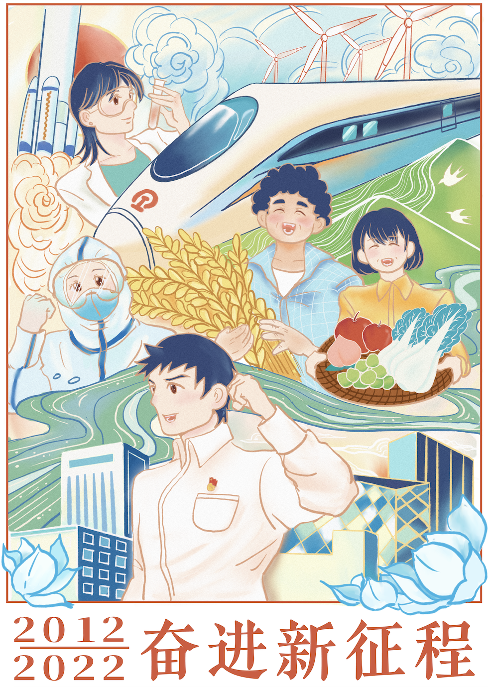 画面融合了夸父一号、神州十四号、航母、农业、城市化、高等教育等元素,展现了中国近十年的发展。