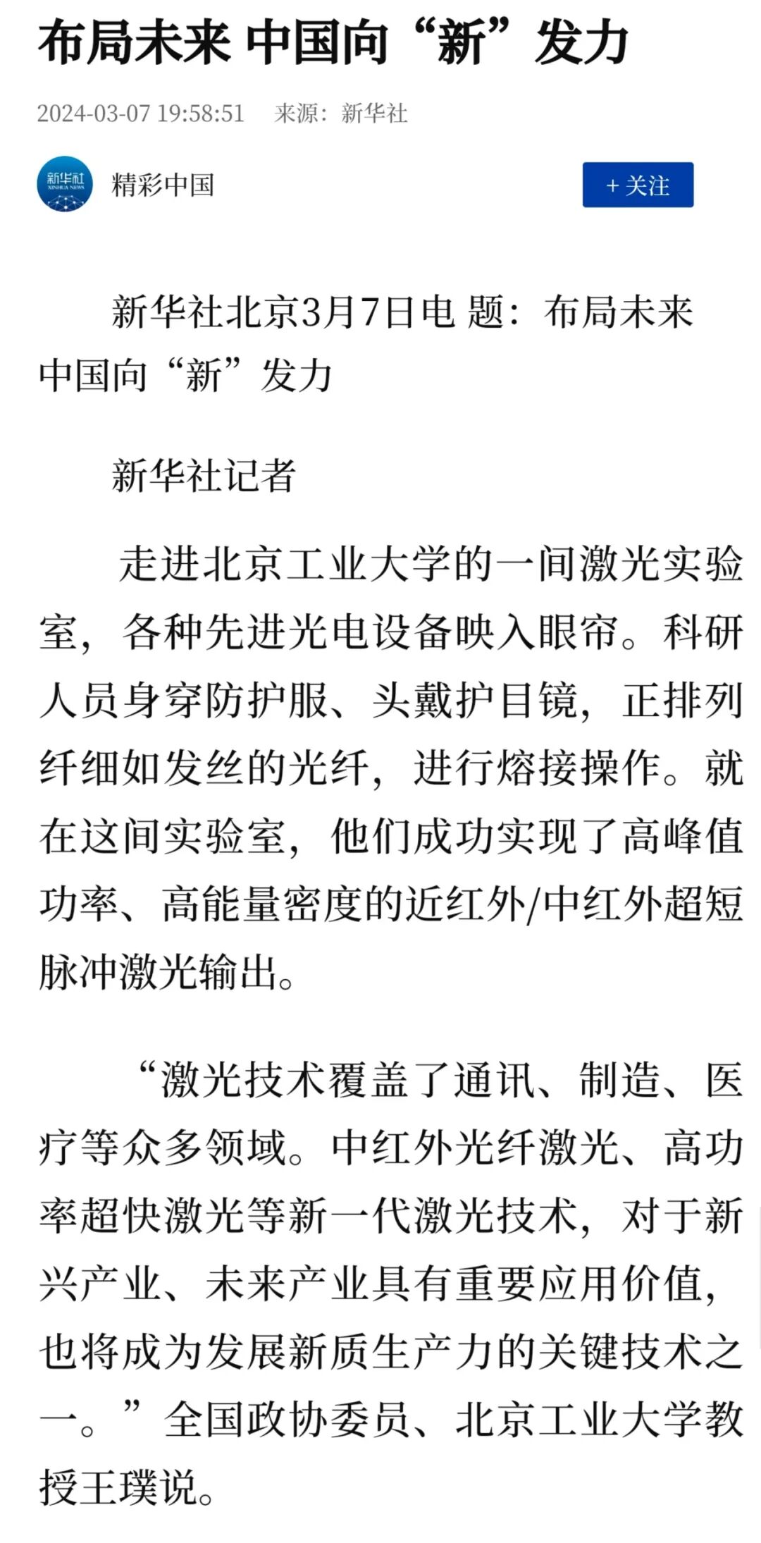 报道北工大研发新一代激光技术