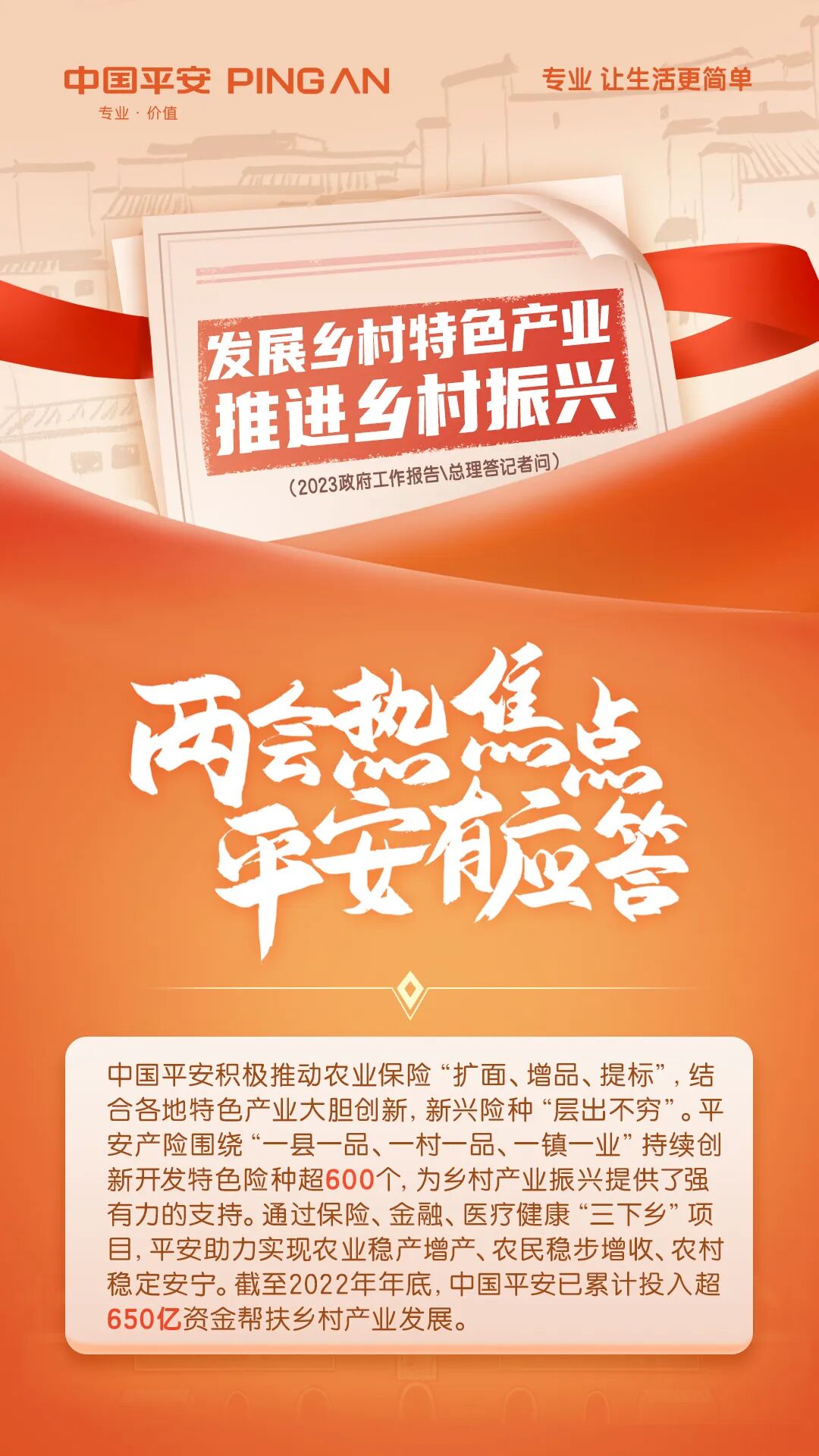 2022年,为全面匹配新发展阶段需求,中国平安在“三村工程”基础上,以党建共建点为引领,再开展保险、金融、医疗健康“三下乡”项目。截止至2022年年底,中国平安已累计投入超650亿资金帮扶乡村产业发展。