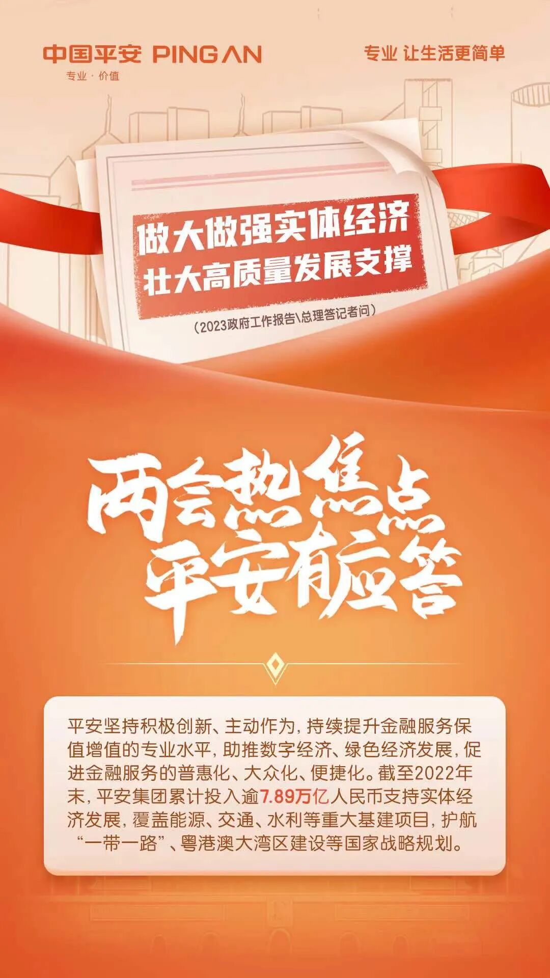 自成立以来,中国平安始终坚持服务国计民生,以满足人民对美好生活的向往为使命,以实现中华民族伟大复兴为己任,坚定不移走高质量发展之路。未来,中国平安将继续坚持积极创新、主动作为,增强金融服务实体经济质效、增强金融服务民生功能、增强金融服务助力乡村振兴,全方位推进高质量发展,让金融创新成果惠及千家万户。
