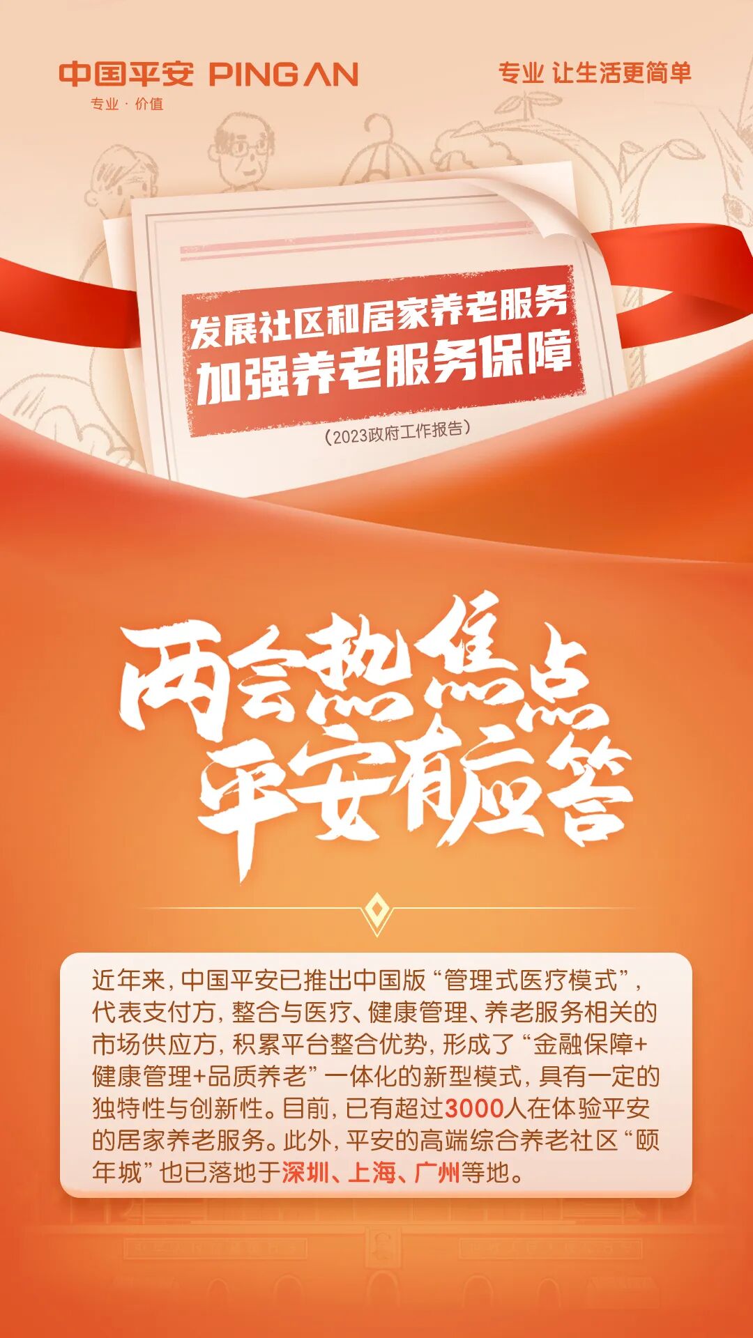 近年来,政府工作报告持续聚焦养老体系的健全。过程中,商业保险参与养老护理产业链条建设成为了重要支撑。以中国平安为代表的险企积极响应政策号召和市场呼唤,率先入局探索“中国式养老”。