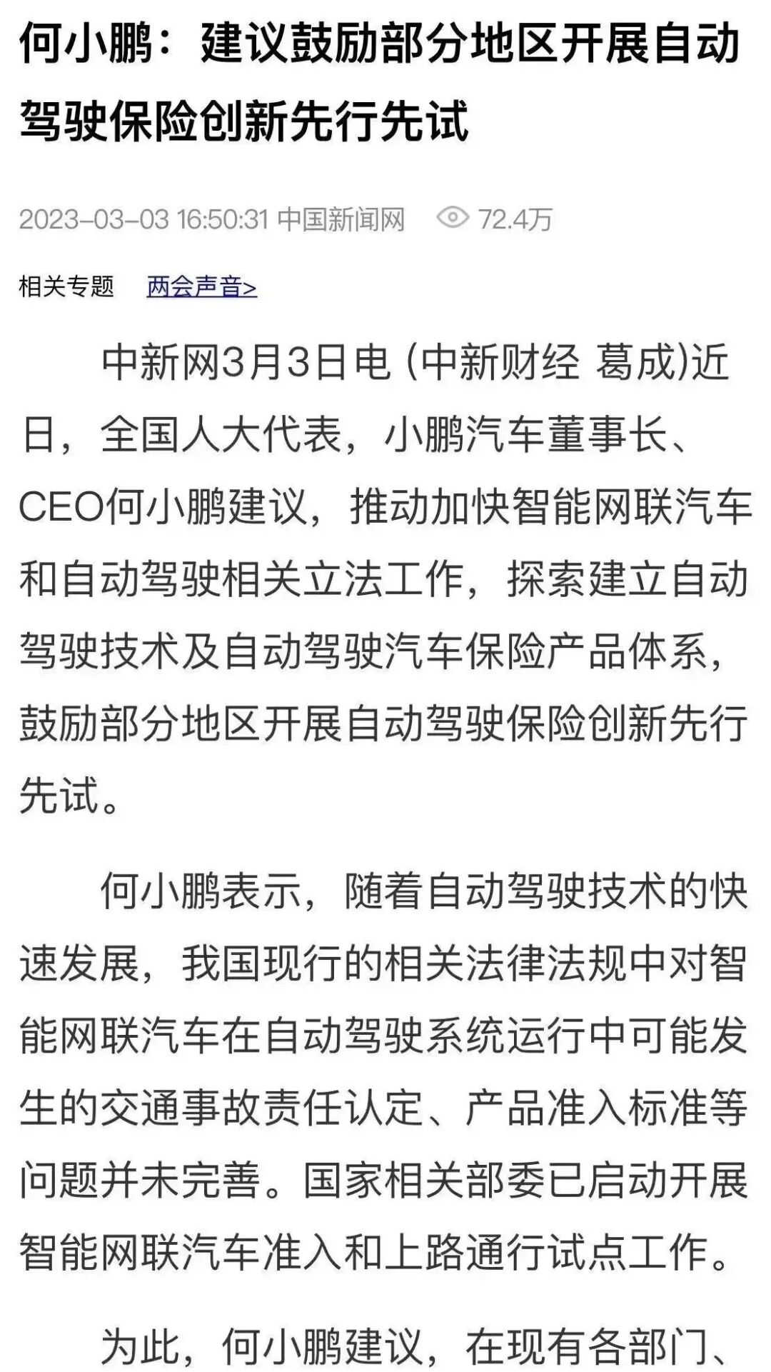 小鹏汽车董事长、CEO何小鹏今年首次当选为全国人大代表,向大会提交《关于探索加快自动驾驶应用落地体系化保障的建议》。作为从成立之初就扎根广东的智能制造企业,以及中国首家在自动驾驶领域坚持全栈自研的品牌,我们结合自身的探索和实践所给出的建议,不仅对自动驾驶行业的高质量发展起到了推动作用,也引发了众多主流媒体的关注。小鹏汽车董事长、CEO何小鹏本次主要围绕自动驾驶行业的问题提出建议。针对我国智能网联汽车产业快速发展、自动驾驶技术加速发展和落地这一趋势,何小鹏提出了三点建议:推动加快智能网联汽车和自动驾驶相关立法工作、探索建立自动驾驶技术及自动驾驶汽车保险产品体系,以及推动加快城市高精度地图审核流程。