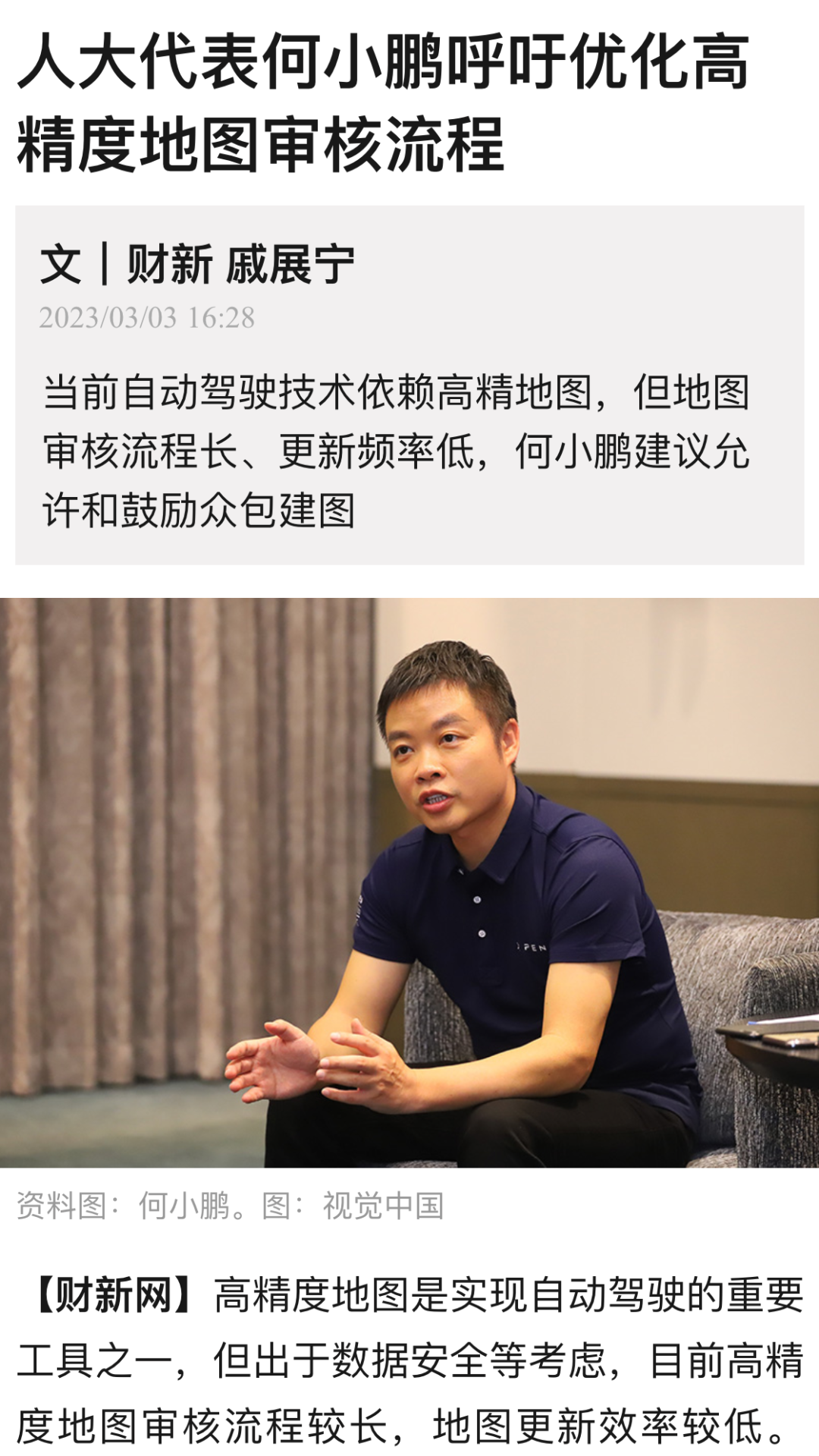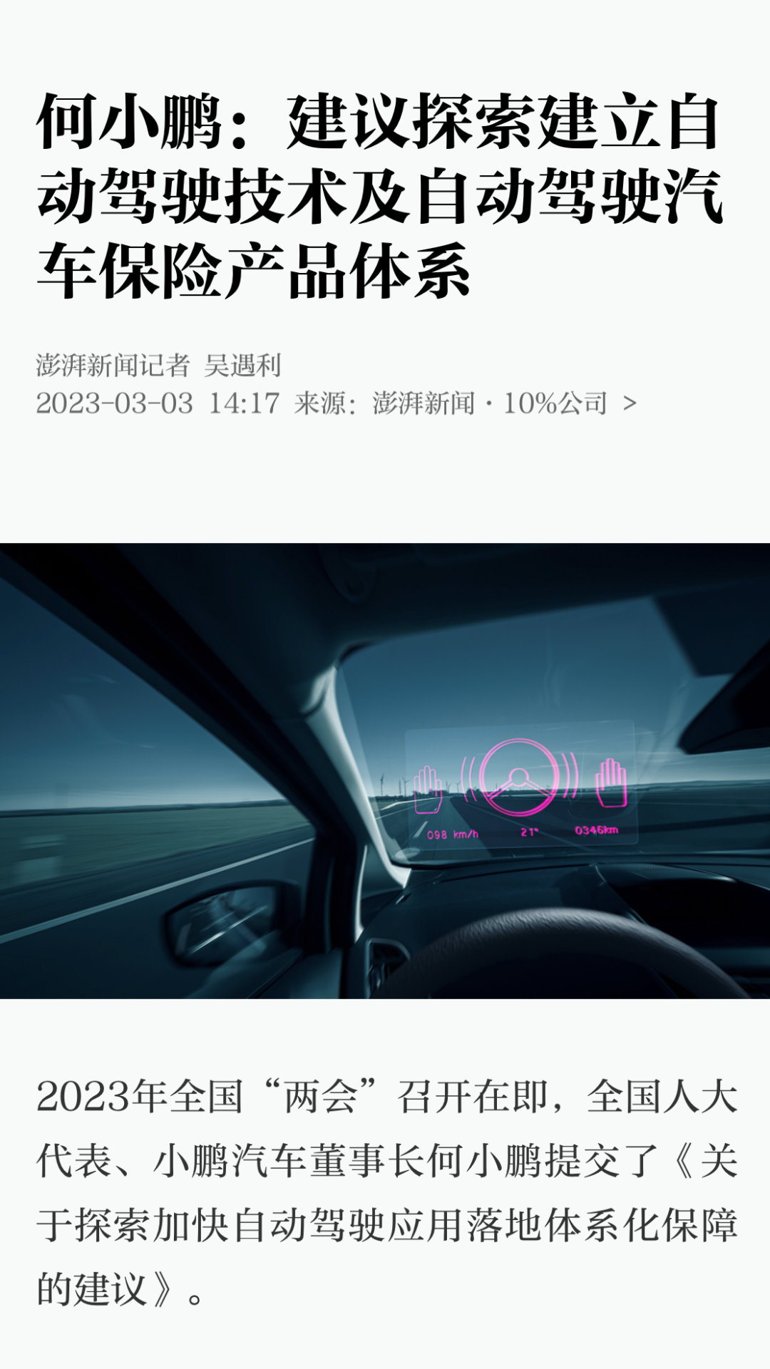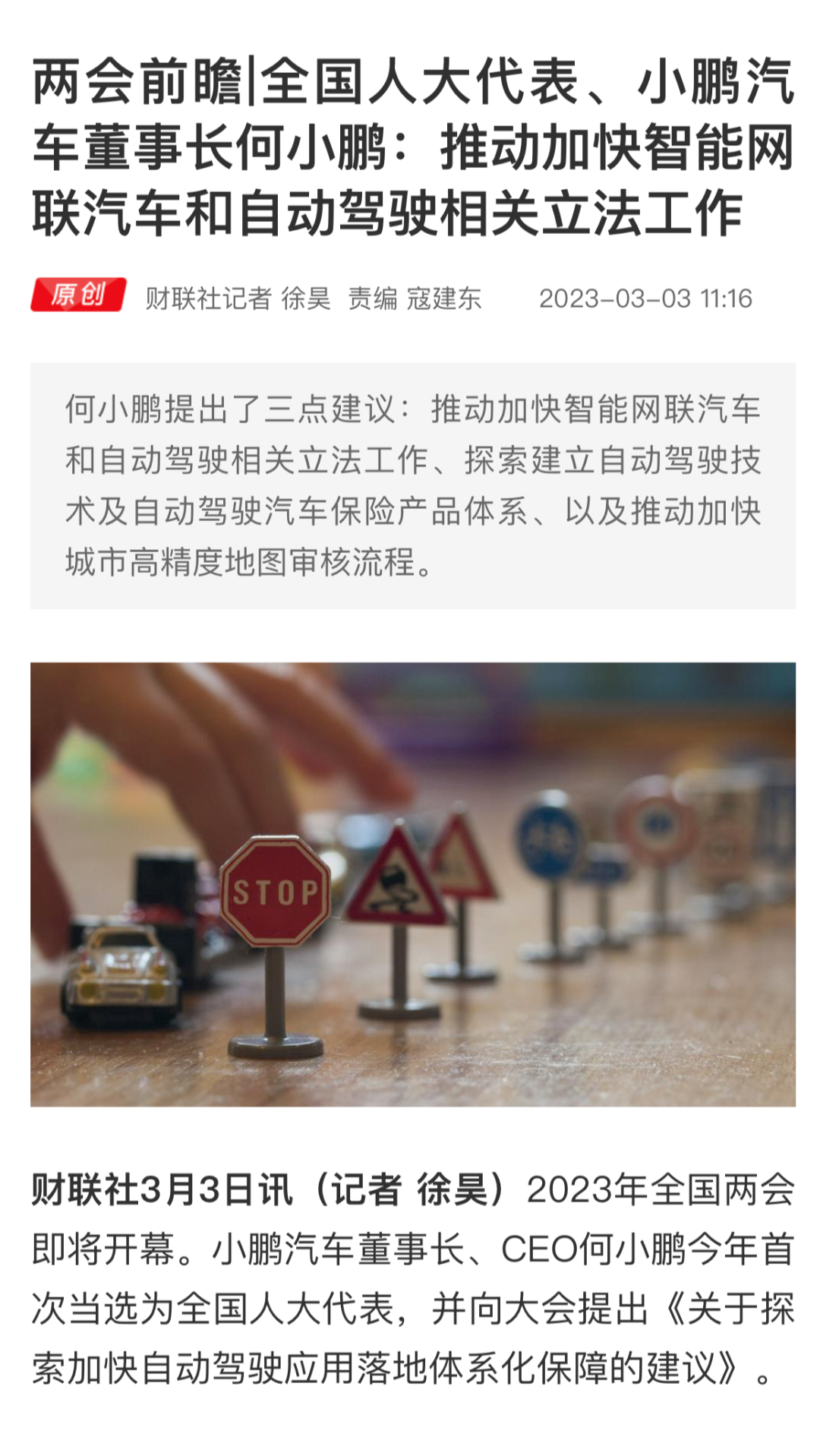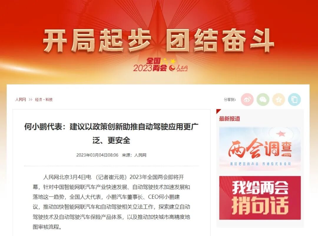 人民网发表了题为《何小鹏代表建议:以政策助推自动驾驶应用更广泛、更安全》的报道,并在报道中指出,“何小鹏此次关于加快自动驾驶应用落地体系化保障的两会建议,从技术创新驱动和优化政策供给等方面提出具体建议,与新时代下我国汽车行业发展趋势和经济发展战略高度契合,有利于推动我国战略性新兴产业实现高质量发展。”