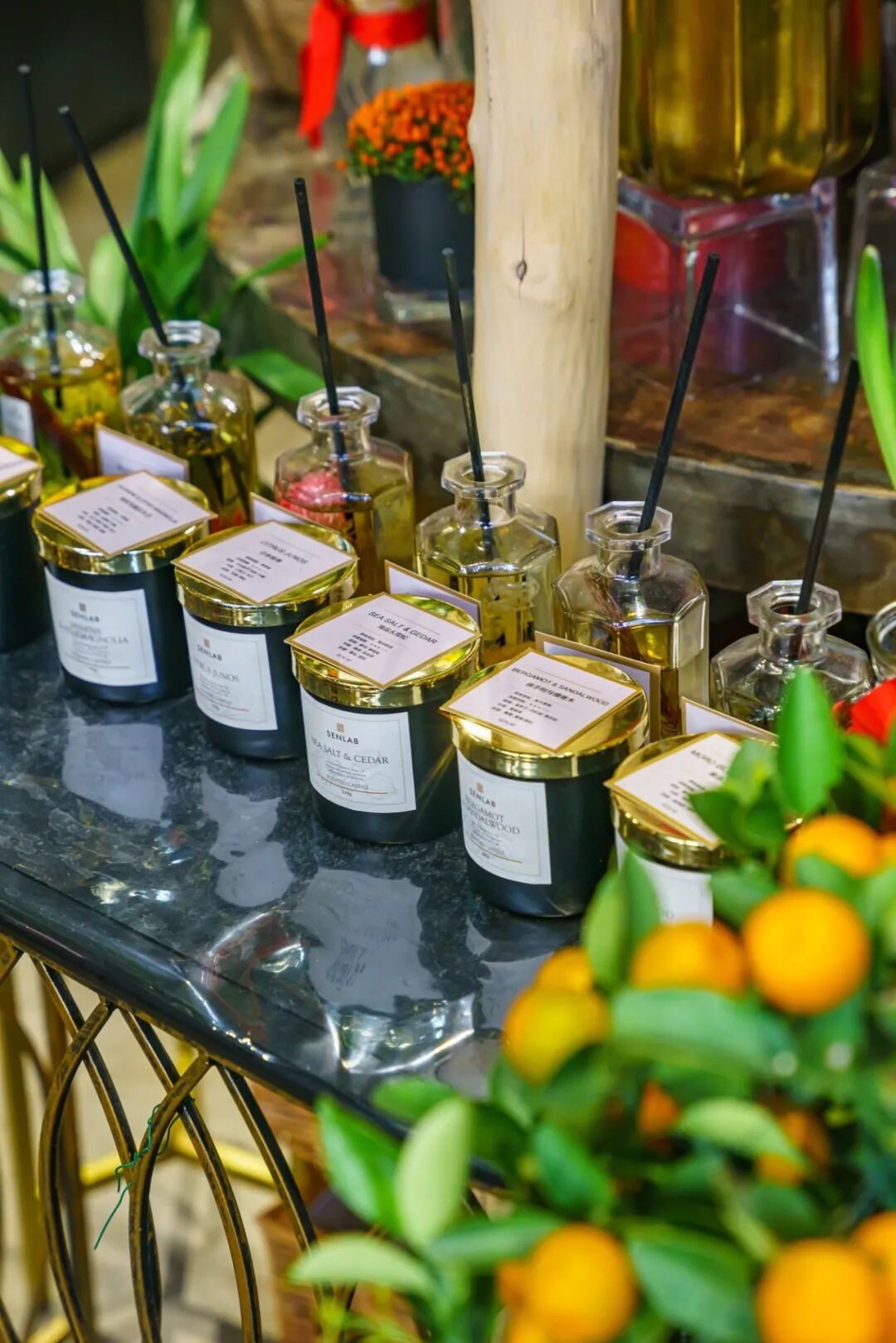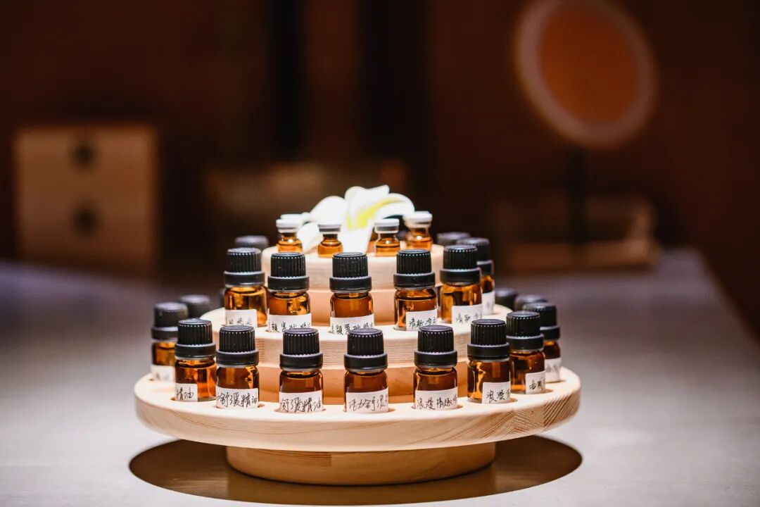 在过道左侧,有一面延长近10米的精油柜,摆放了百余瓶由德国进口的治疗级精油,种类齐全,完全不输大型SPA馆!