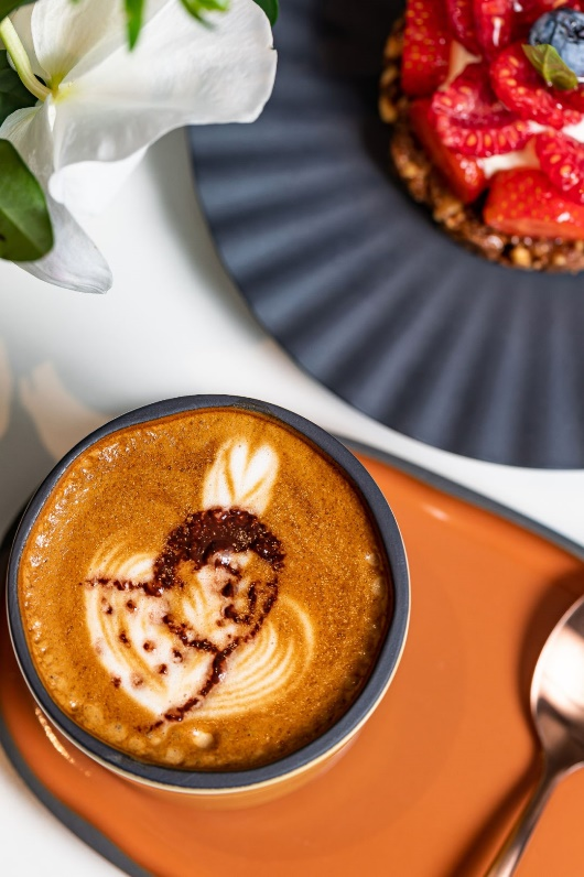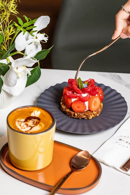 如果想体验一次潮奢风的下午茶,去潮一不贰准没错!位于外滩源的潮一不贰,是一家潮奢快闪+甜品咖啡+创意花艺的集合店,法甜和艺术展都能在这里一次性打卡。店里的网红C位——露天喷泉花园,正好适合初夏。点一份经典的法式甜品,配上有着丑萌冲浪鱼logo拉花的拿铁,下午茶氛围感拉满。这里的甜点完美体现了法甜的精髓,甜但不会觉得腻。而且每一款甜点的颜值都很高,形似巴黎圣母院花窗的国王饼更是要提前两天预定才能拥有!