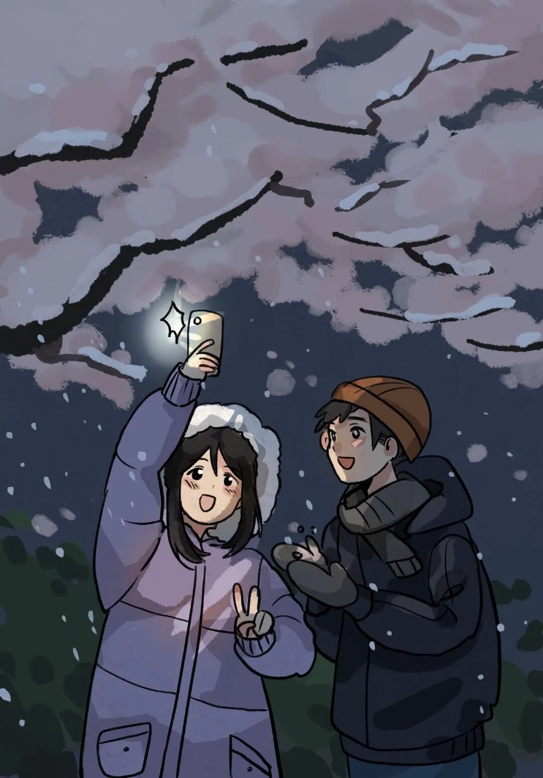 残冬回访,雪花与山桃争胜的奇景引得行人驻足。