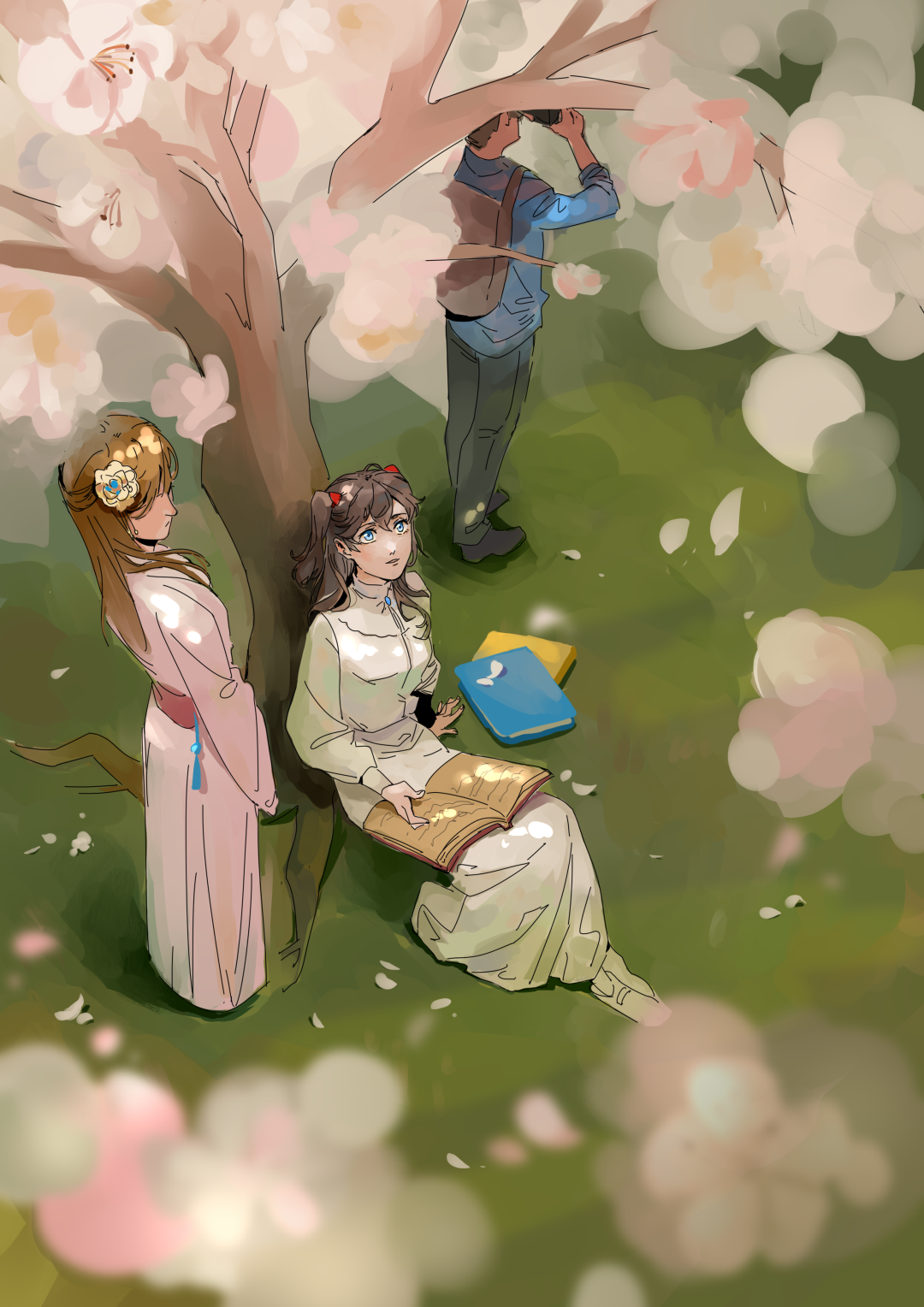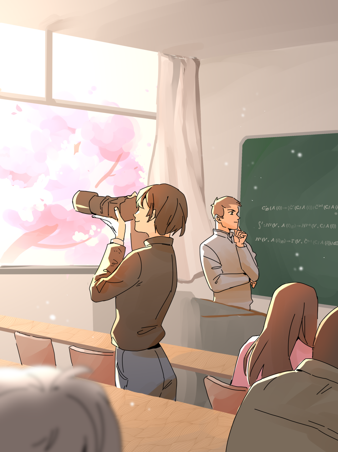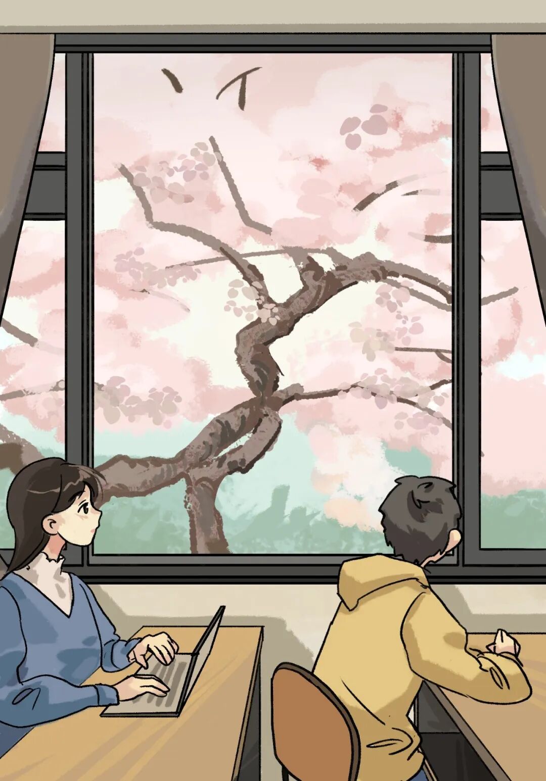 山桃盛放,灿如烟霞,明净的窗装裱起春日胜景,为三教的白墙添了幅天然挂画。