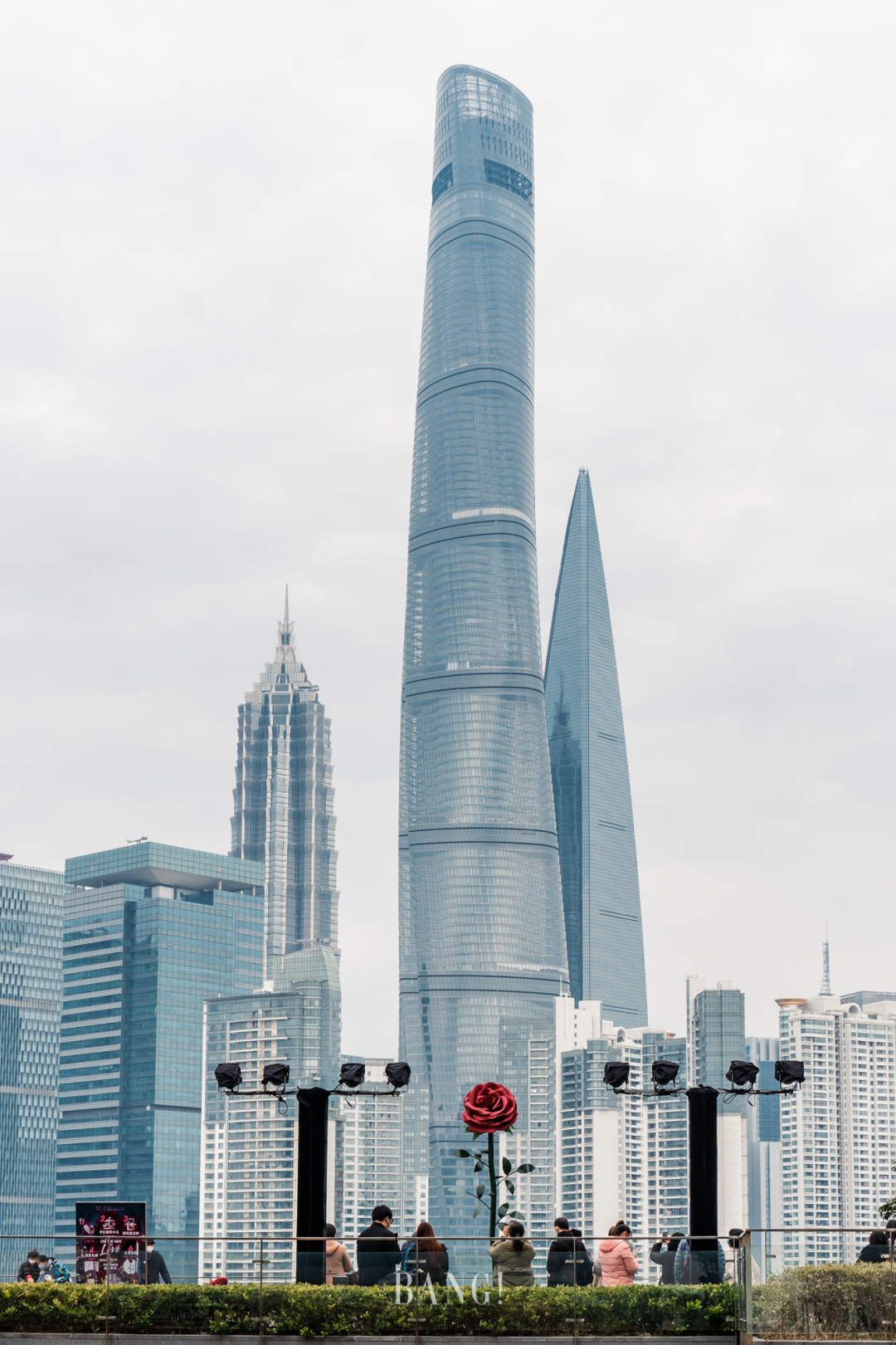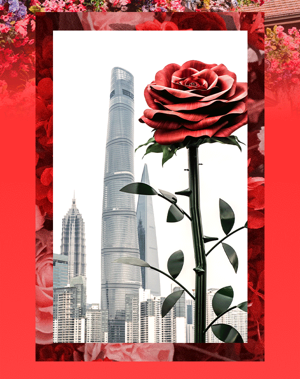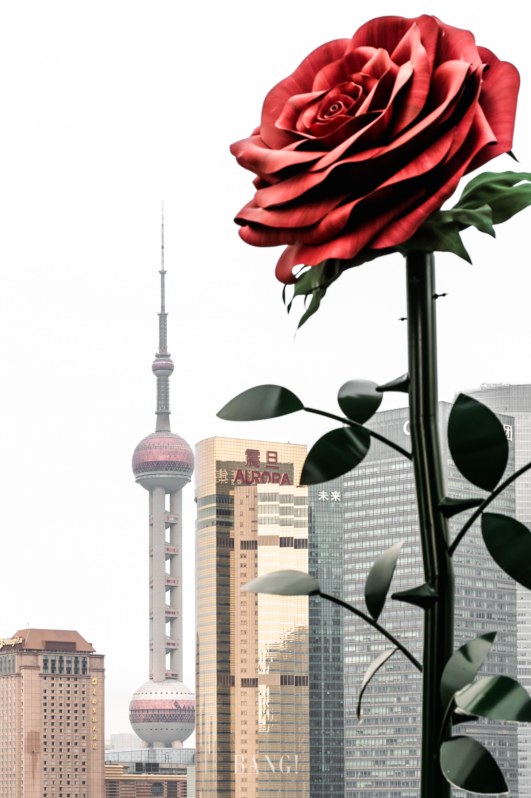 在浦江两岸的高楼下,这朵“玫瑰”除了浪漫还透露出了一丝朋克的感觉,这样混搭的上海,你爱了吗?