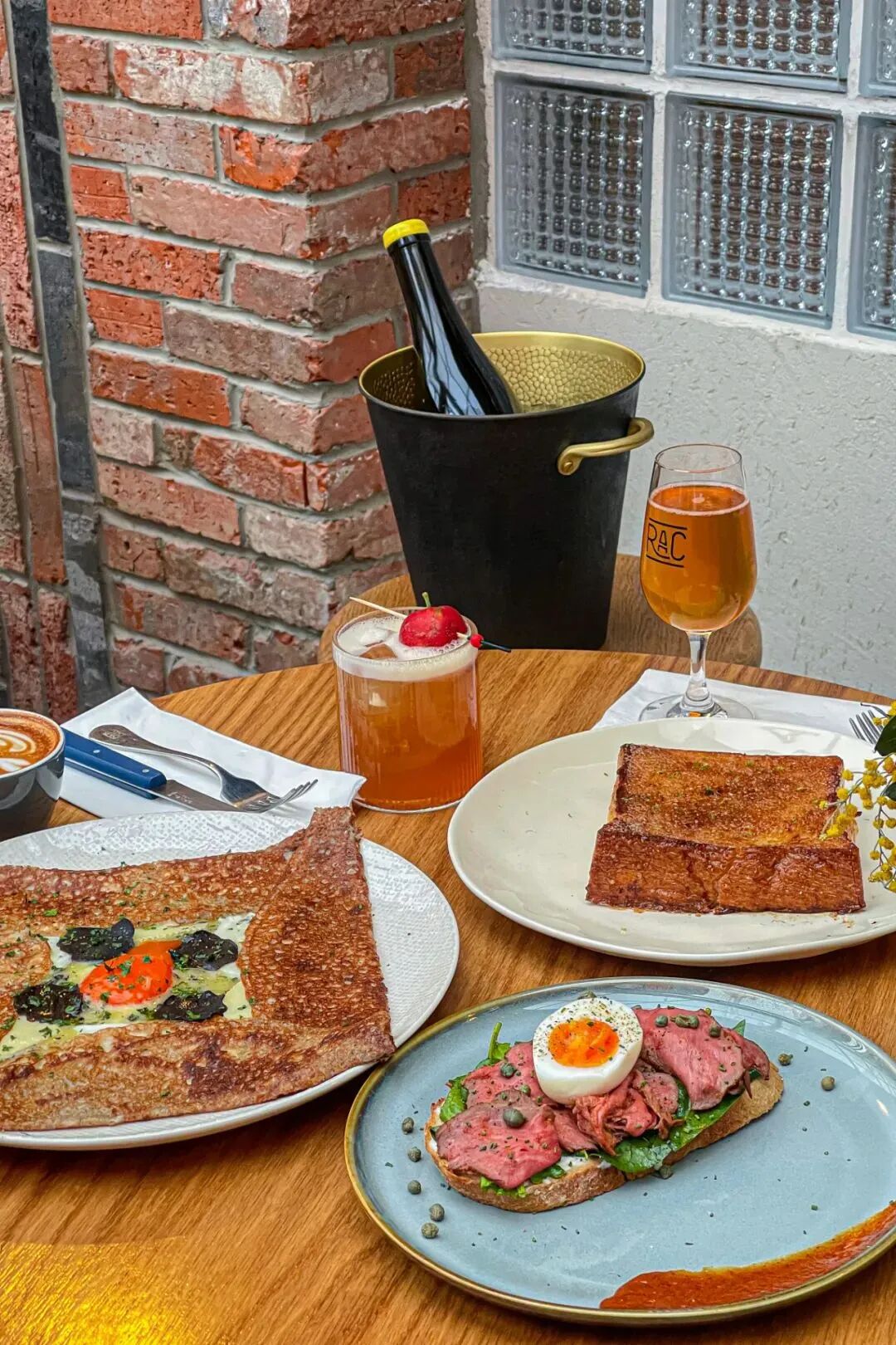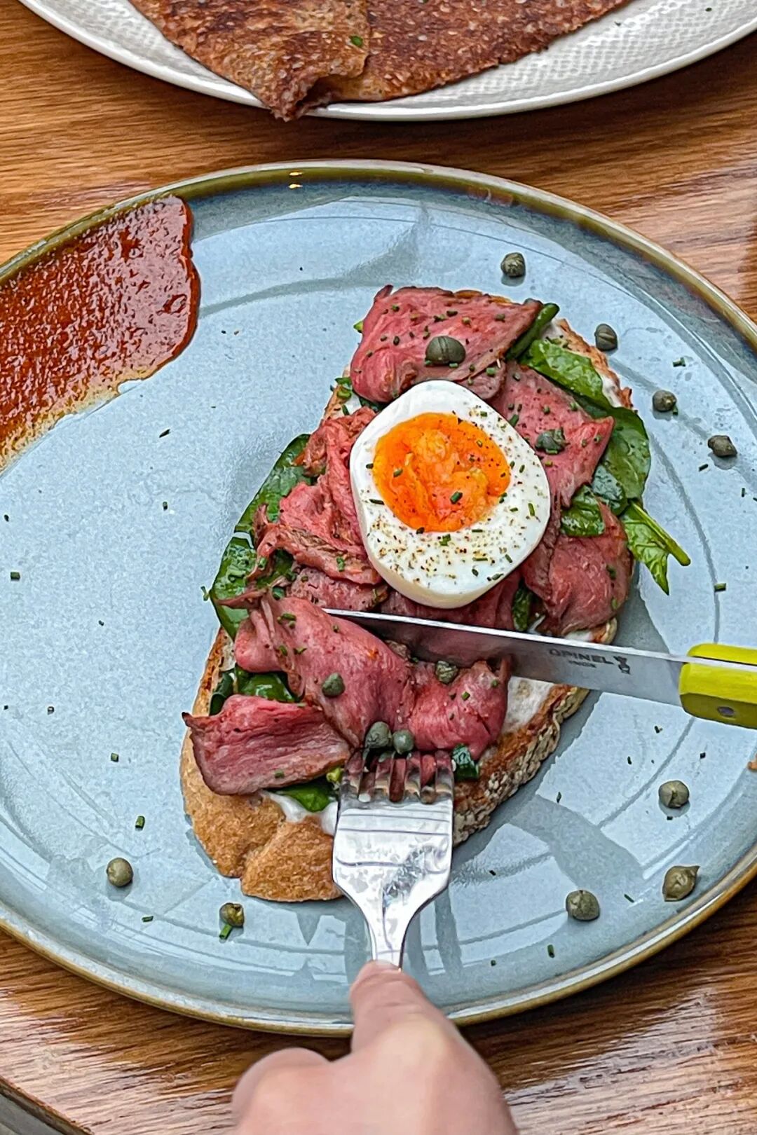 必点的烤牛肉吐司,以冷制的和牛肉搭配烤得酥脆的法式酸面包,加上丝翠奇亚奶酪和主厨自制的烟熏蛋黄酱,一口层次丰富、肉香十足。巴黎火腿可丽饼、牛油果鸡蛋吐司、法式厚吐司等人气美味也足够吸引!~