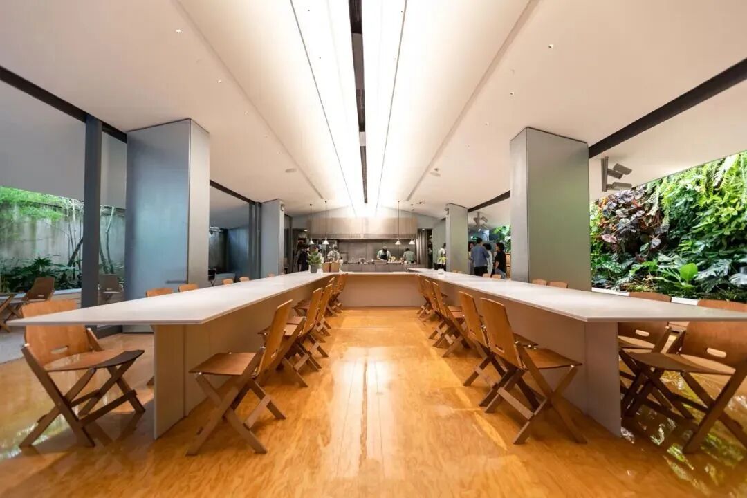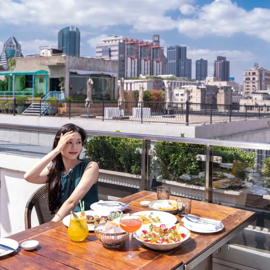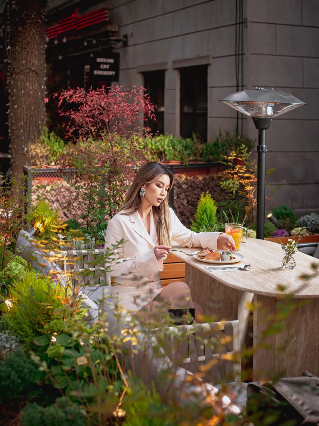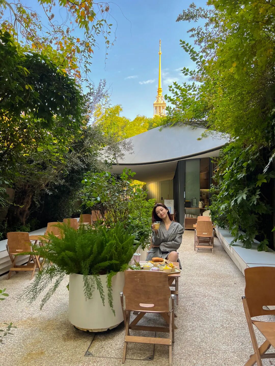 在静安寺大隐于市的CUCURUCU,拥有一处宽敞的庭院。满眼的绿植,随意散落的桌椅,无一不给人轻松惬意的氛围感。