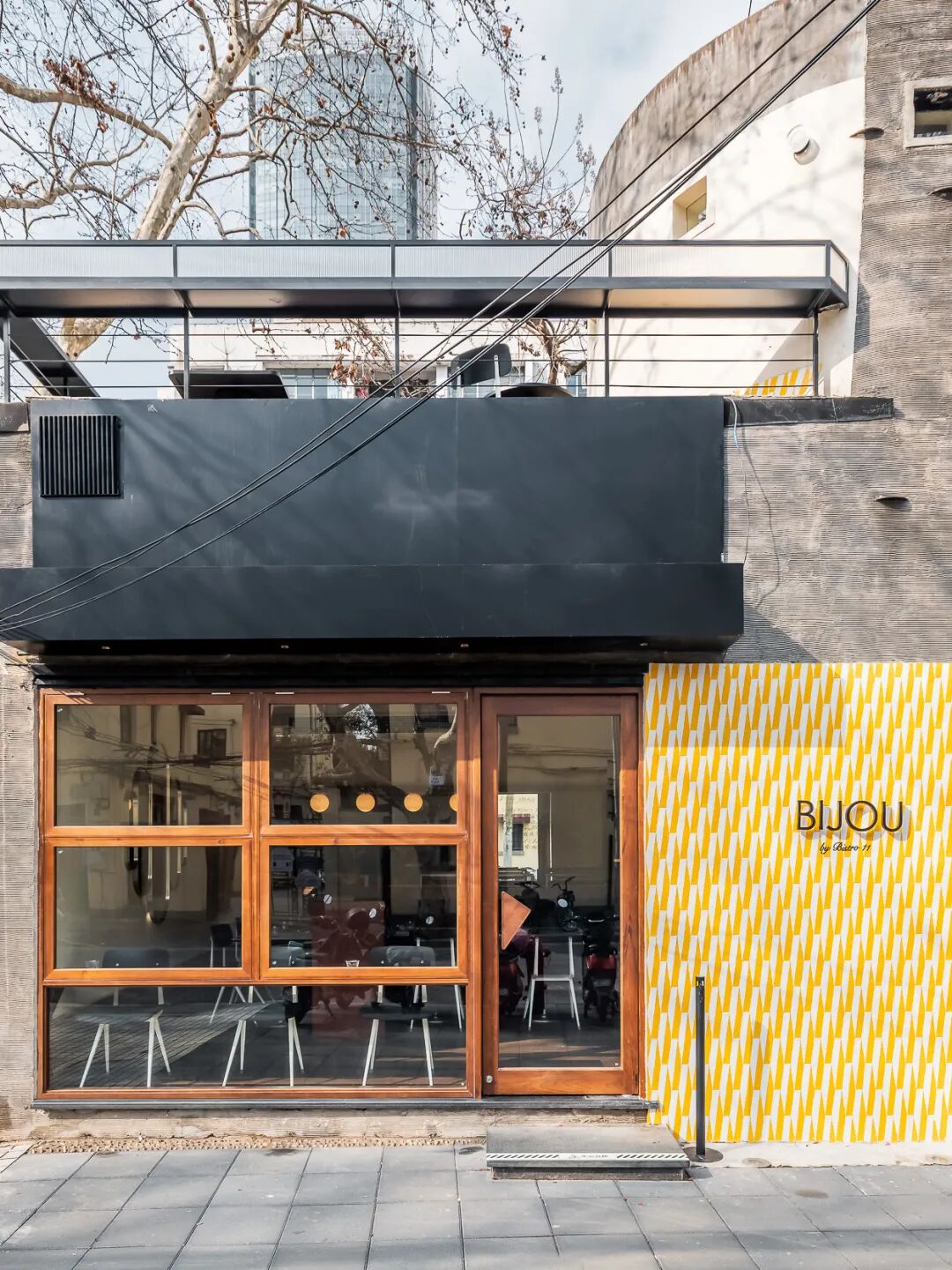 藏身五原路的沿街温馨新店BIJOU,单是以木质色调搭配玻璃门窗以及橙白色LOGO墙的门面,就非常出圈!
