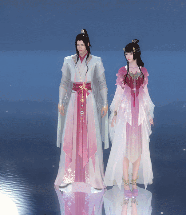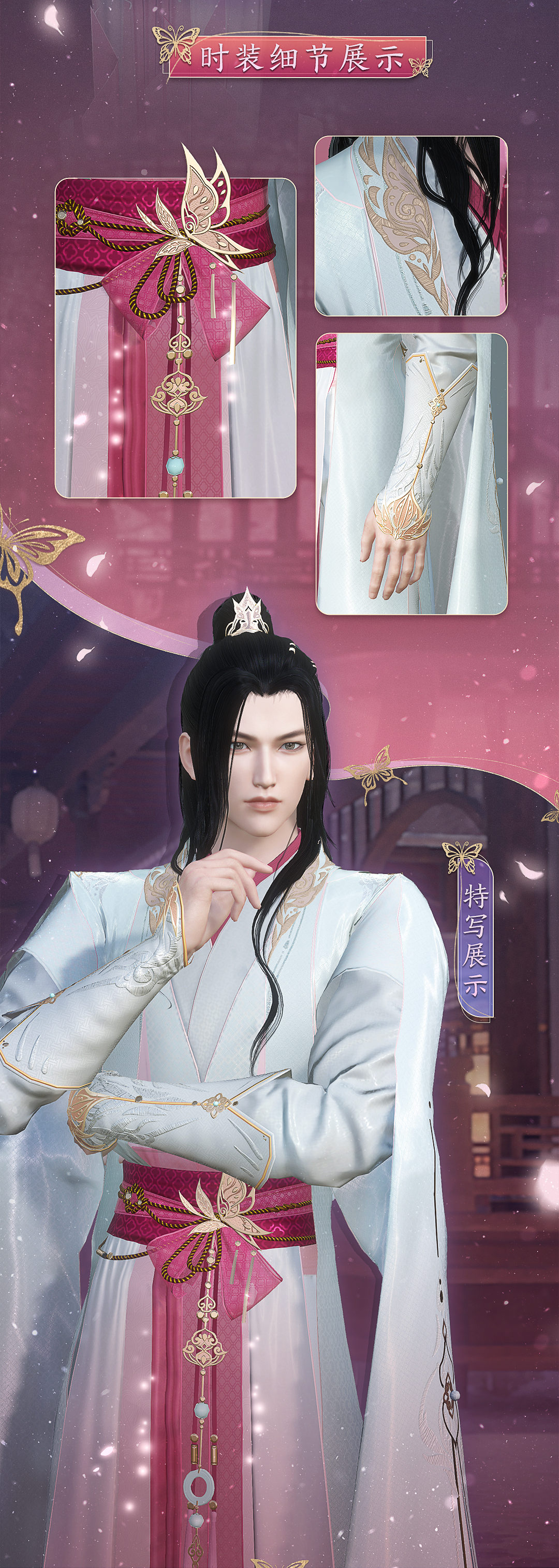 相比于女款,男款对粉色的使用更为克制——通体以雪白为主,仅在内衬、腰带、蔽膝、下摆处使用了小面积的粉色,显得文质彬彬,又与女款相得益彰。