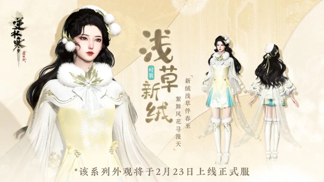 这周四(2月23日)更新后,正式服艮岳奇珍就将上新【浅草新绒】,老兵服也将同步限时上线【樱岚时装礼盒】和【月川青丘礼盒】,趁着好春时,快穿上新衣去赏花吧~