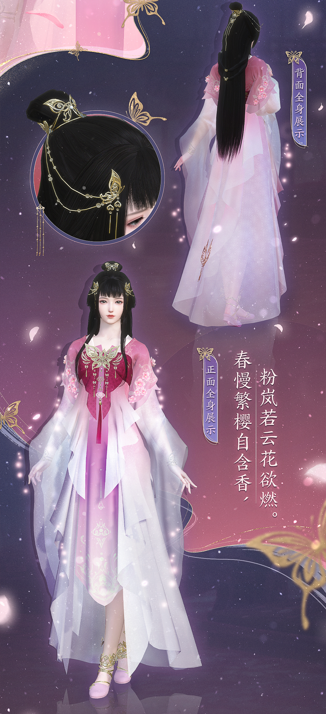 女款【樱岚含香】清秀俏丽,娇嫩的粉色将少女的娇憨展现得淋漓尽致。上臂的细密刺绣花朵,栩栩如生,可见绣娘功力之高超、衣衫之罕得。