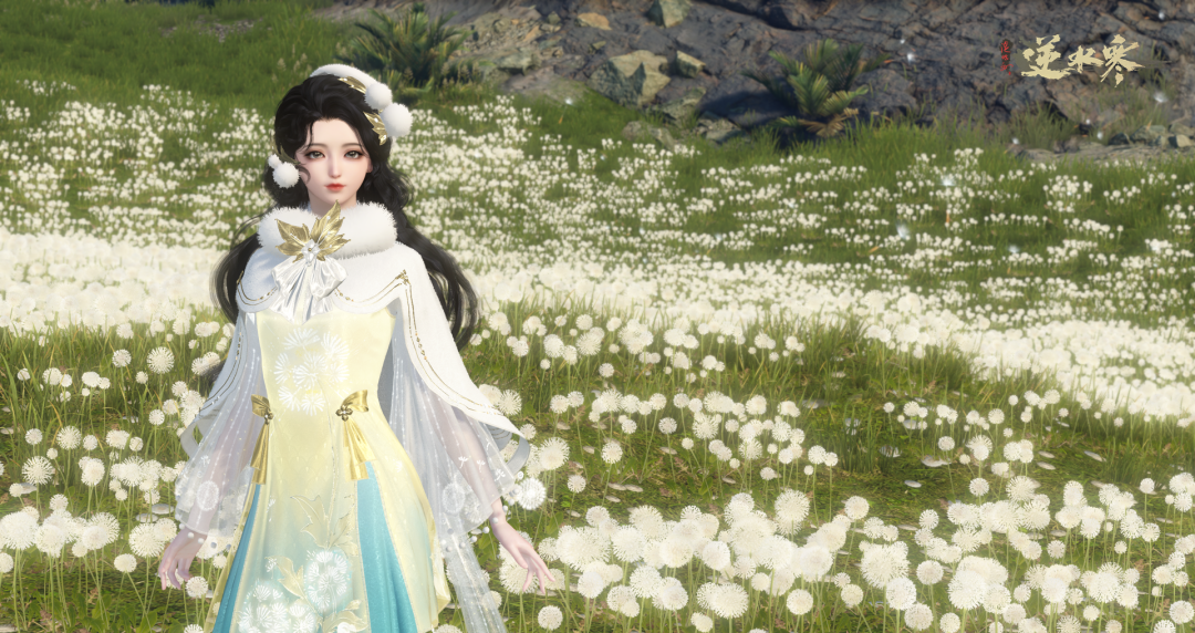 女款【浅草新绒】头饰多用雪白毛球,可爱俏皮,恰似圆溜溜的蒲公英生在青丝上。白色毛领披肩下,是绣着蒲公英花纹的轻纱,既保暖,又轻盈,正适合乍暖还寒的春日。