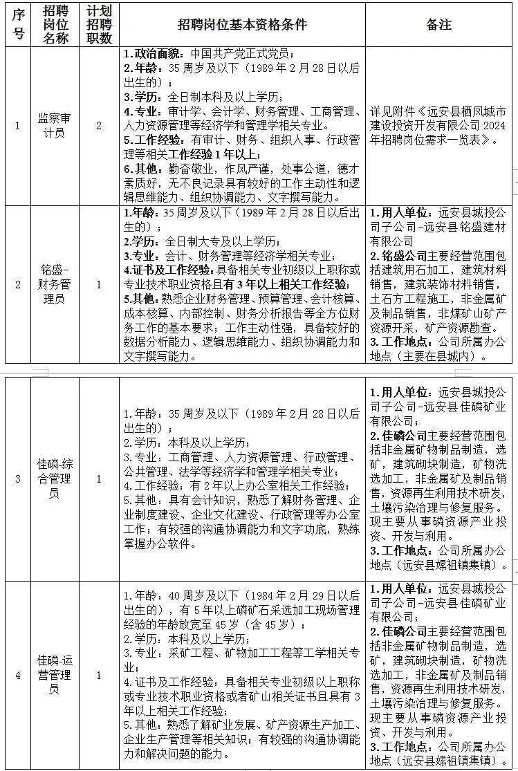 2.报名方式:现场报名。报名时须携带本人毕业证、身份证、职称证书、职业资格证及其他证件原件、复印件各一份,近期免冠一寸红底彩色登记照片1张;填写《远安县栖凤城市建设投资开发有限公司应聘人员登记表》。
