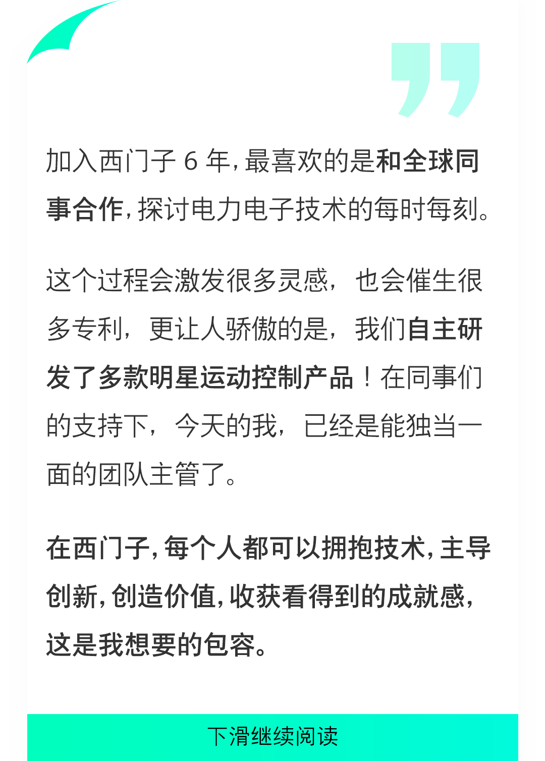 加入西门子6年,最喜欢的是和全球同事合作,探讨电力电子技术的每时每刻。