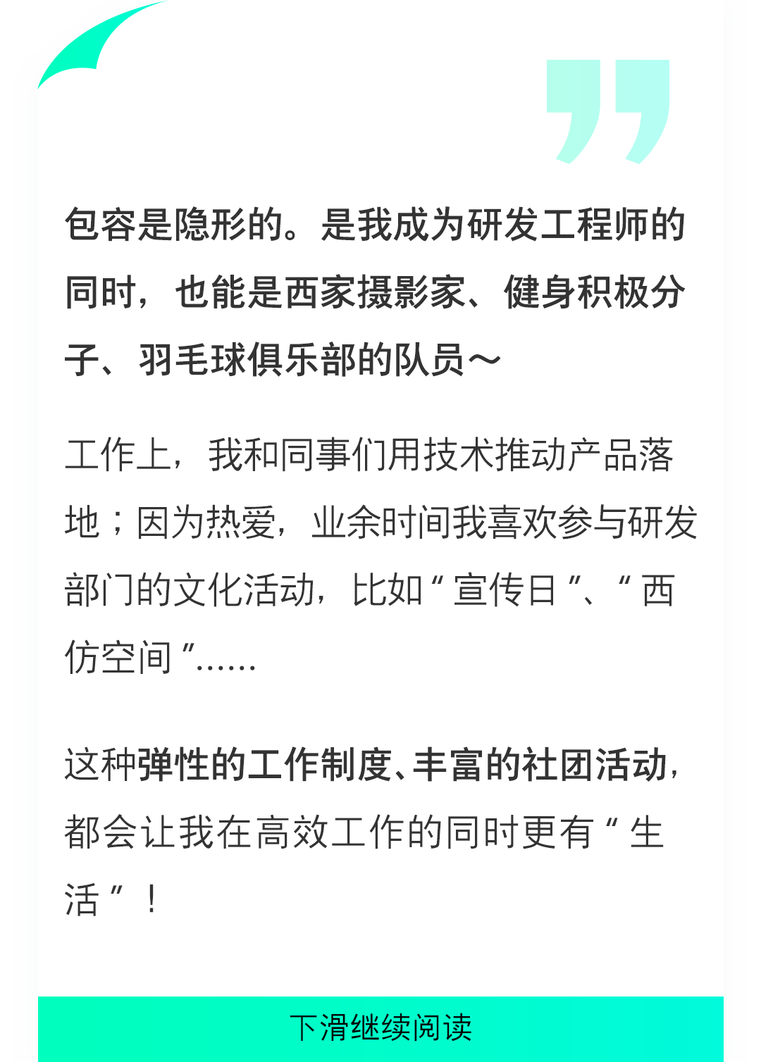工作上,我和同事们用技术推动产品落地;因为热爱,业余时间我喜欢参与研发部门的文化活动,比如“宣传日”、“西仿空间”……