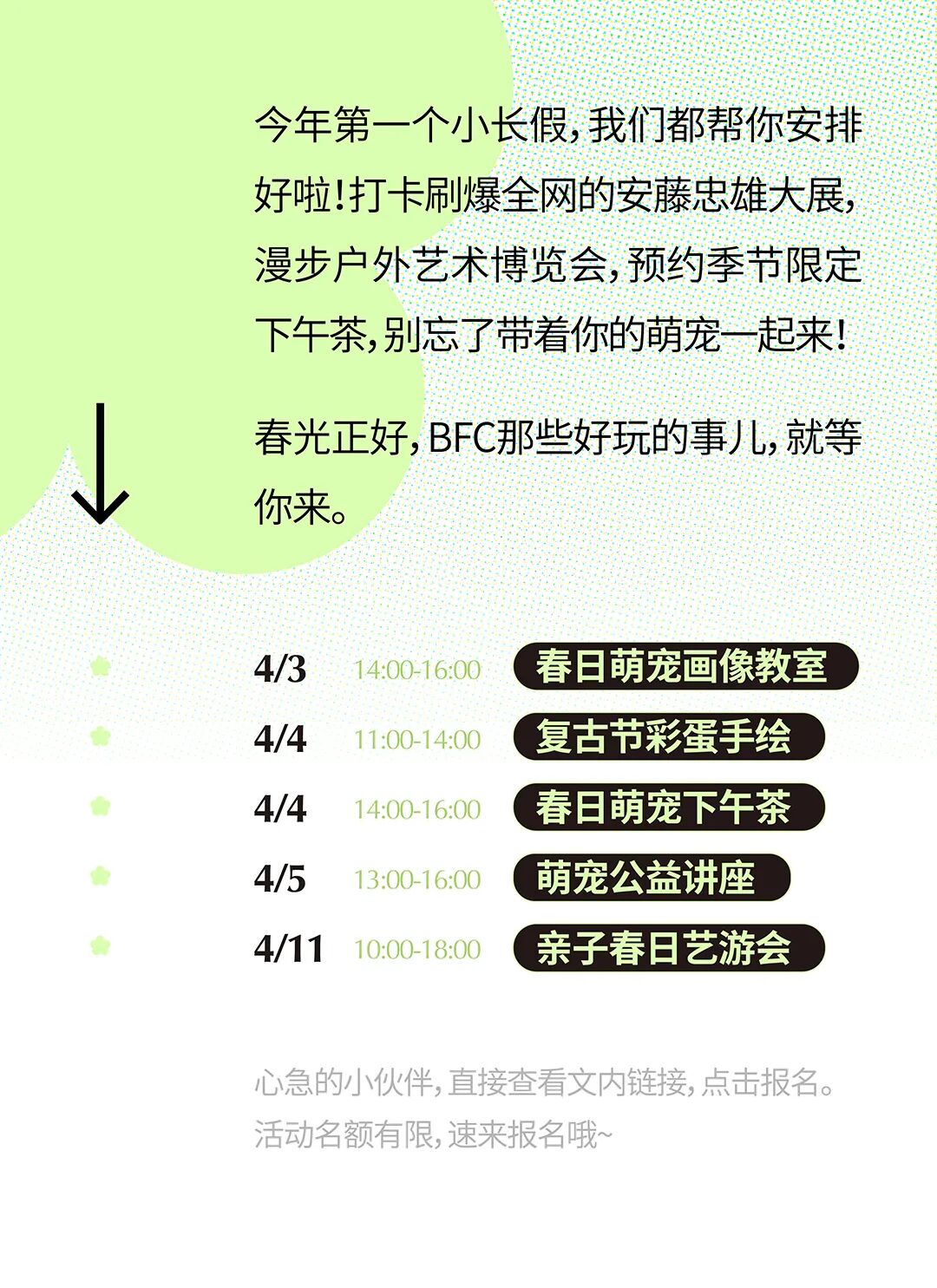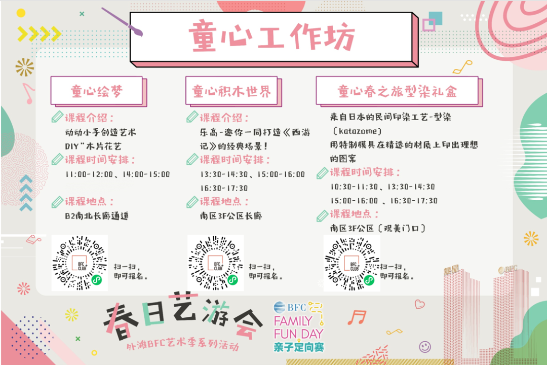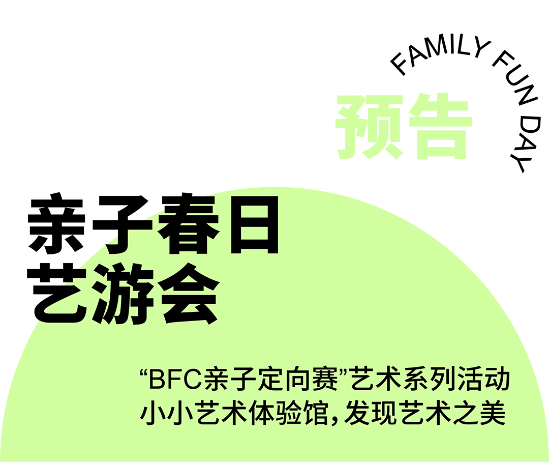 “BFC亲子定向赛”4月全新升级亲子春日艺游会,邀请小朋友成为小小艺术体验官巡礼BFC,发现寻找艺术之美!畅玩五大艺术人文主题区,挑战神秘任务,收集打卡徽章!