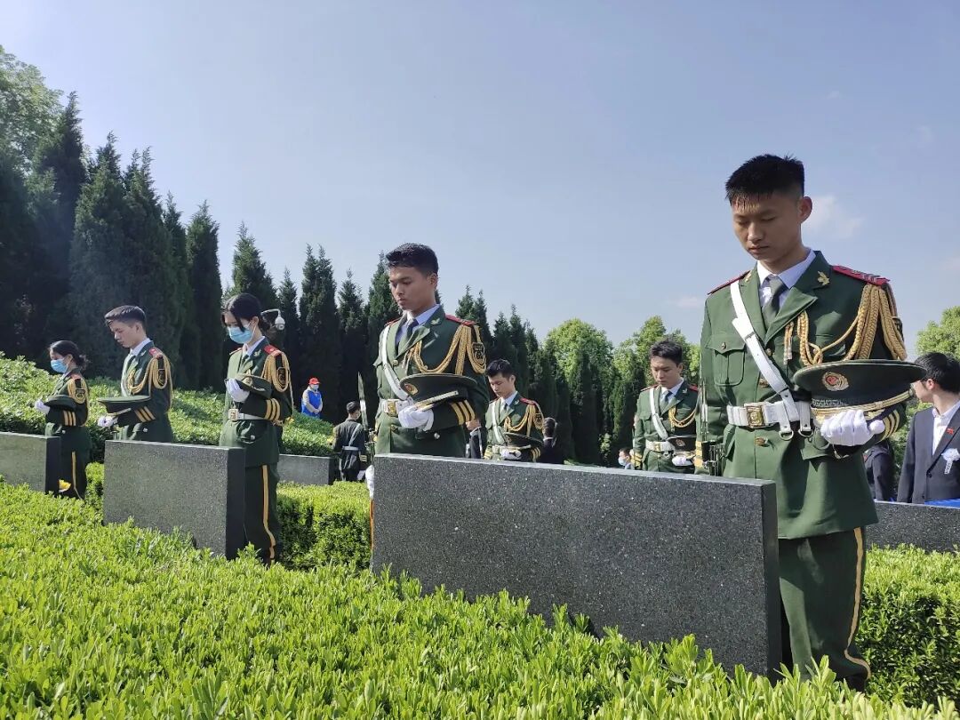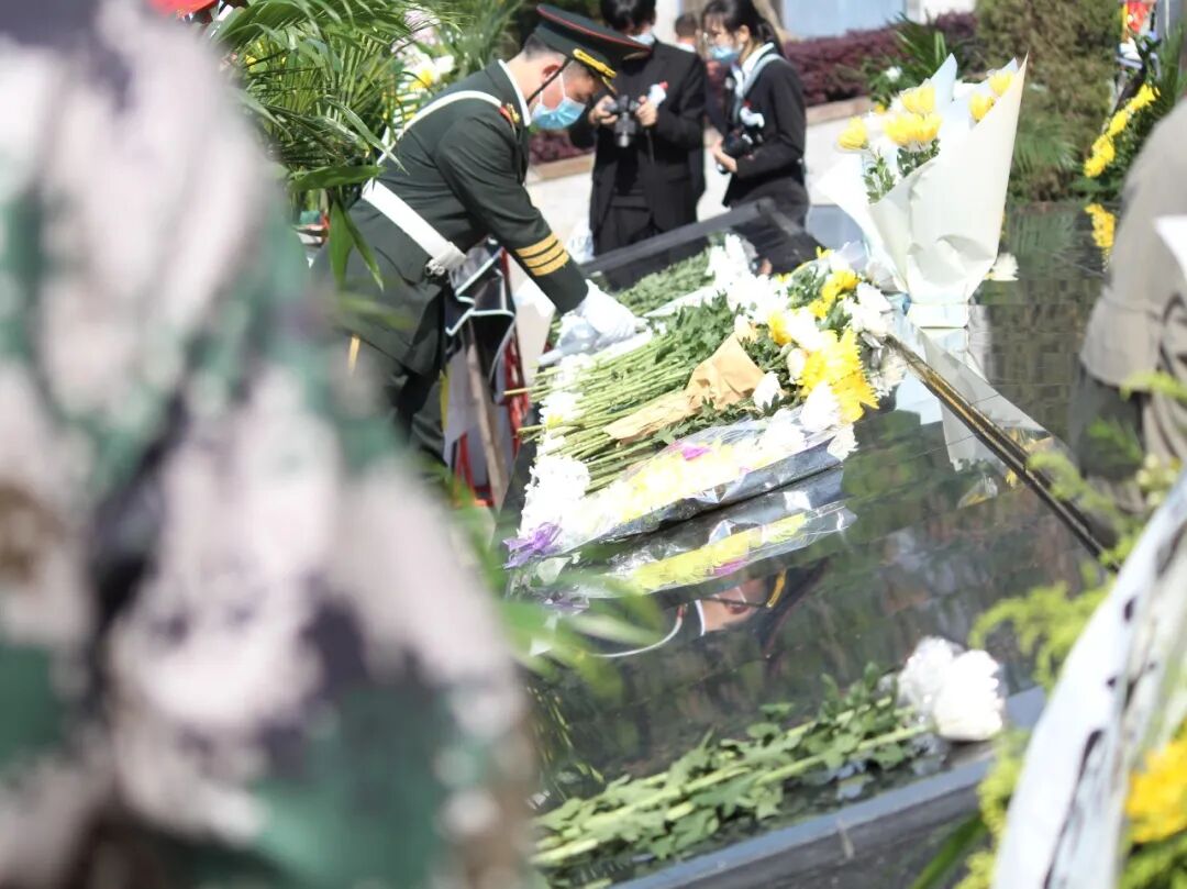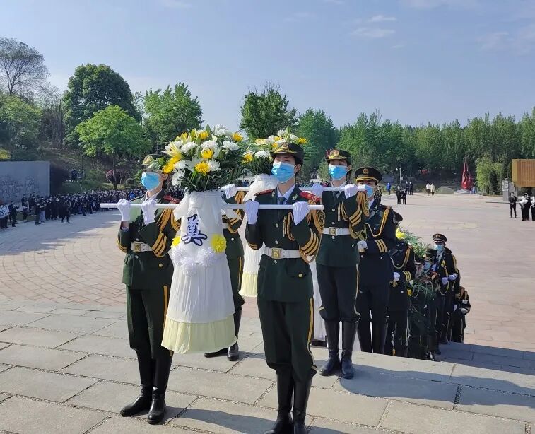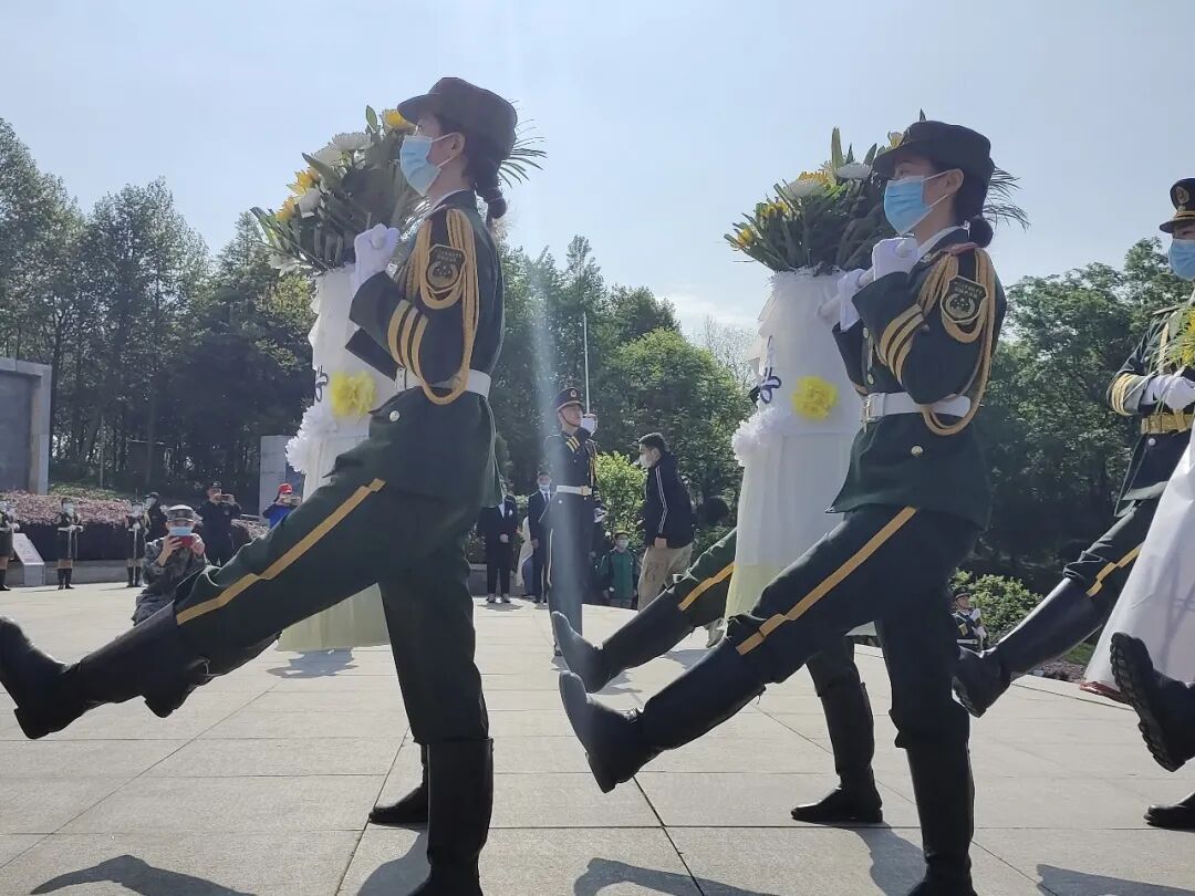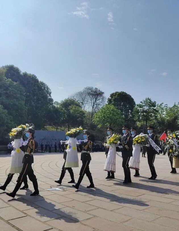 随着军乐团吹响绵长且令人思绪沉重的《献花圈进行曲》,各高校国旗护卫队队员怀着崇敬的心情为革命烈士敬献花篮,表达对革命烈士的无限哀思以及崇敬之心、感念之志。