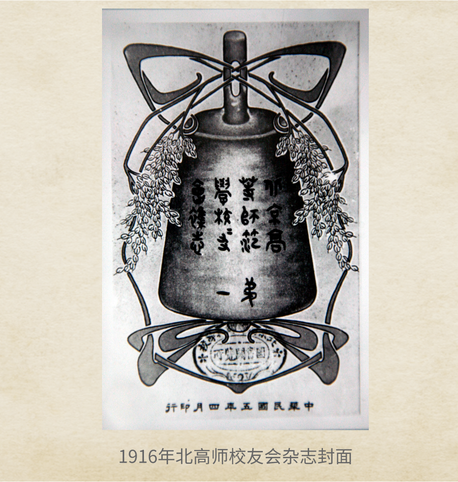 1916年,北京高师出版《校友会杂志》,首辑封面上开始出现“木铎”的图案。北师大最早明确以木铎为校徽始于1931年。在学校印制的《民国廿年师大同学录》的内页,印有“木铎”图案,并注明为校徽。与《校友会杂志》的木铎图案相比,这个构图更为简练,丝带、嘉禾等附着物已不再现。