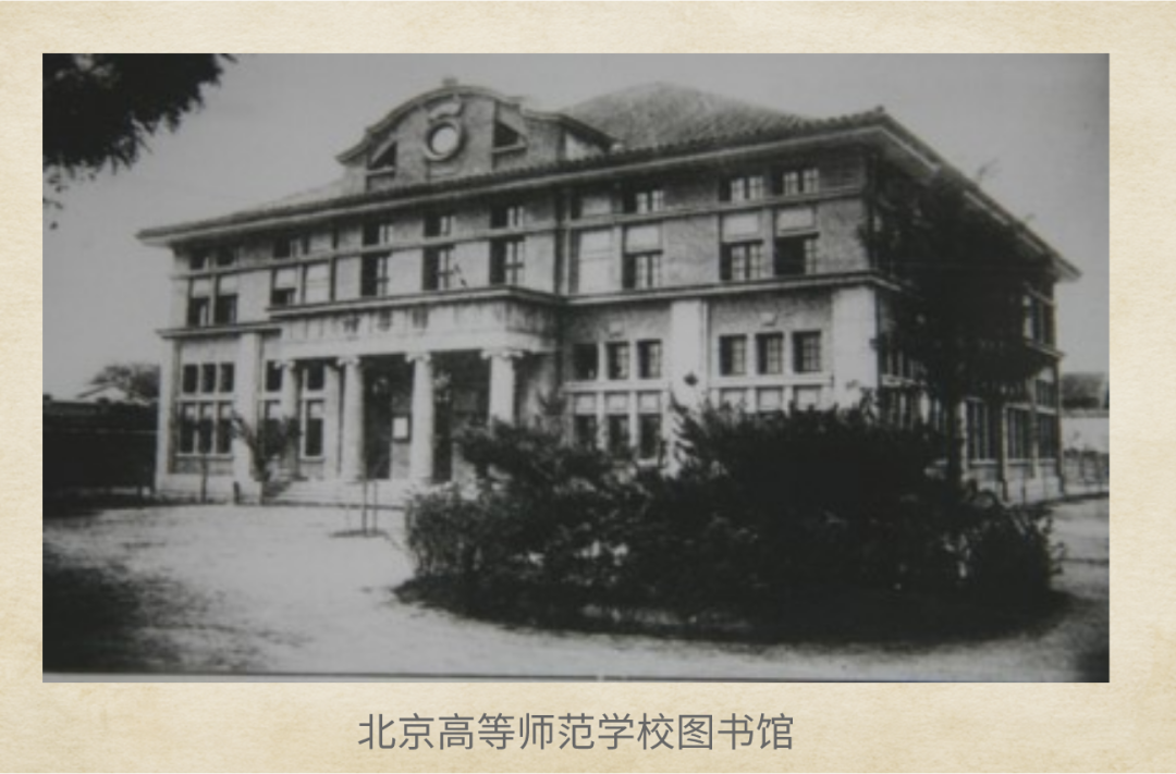 1917年夏,有感于图书分散于各部阅书室而“不相联络,无从统一”的史地部王桐龄教授,将分藏各部图书室的图书和当年新购入的图书杂志集中起来,借用旧礼堂及史地教员室楼房加以整理、重新组织、统一典藏,正式建立北高师图书馆。