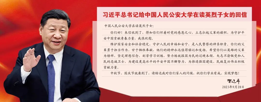 中共中央总书记、国家主席、中央军委主席习近平于2023年9月28日给中国人民公安大学在读英烈子女回信,对他们提出殷切期望,向公安英烈的家人致以问候。