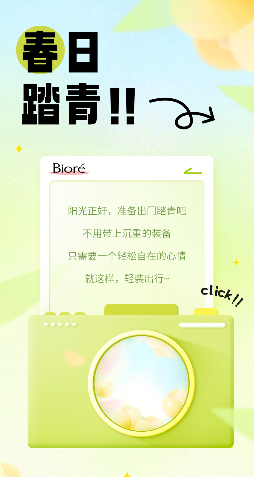 推荐:「点击展开」踏青之旅,依次点击查看春日装备,借此宣传花王碧柔护肤品、防晒霜和洁面等产品。