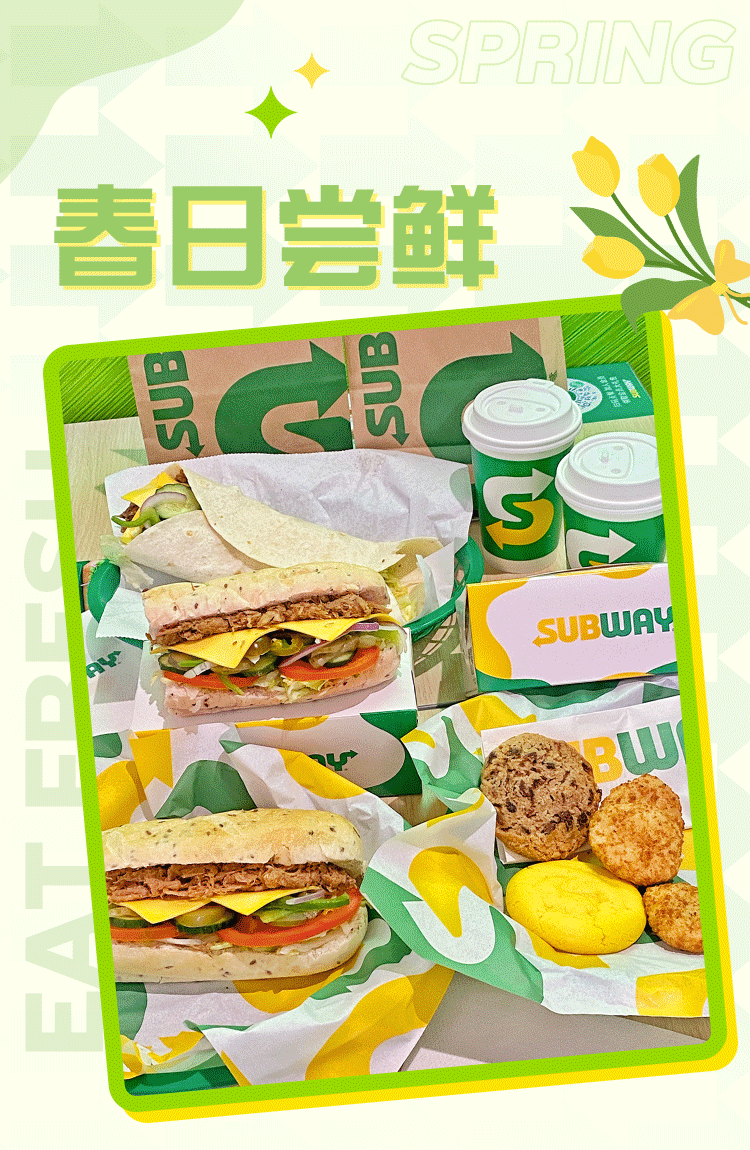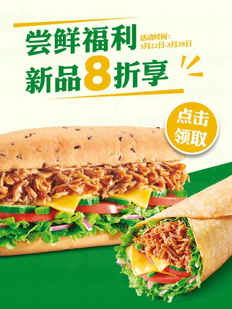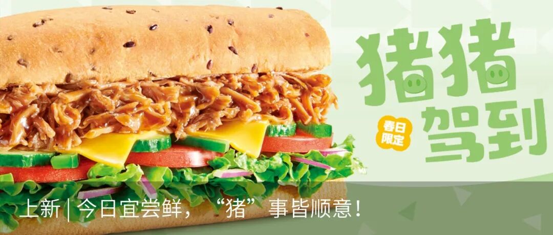 上述产品限于SUBWAY®赛百味大陆地区餐厅2023年3月15日到2023年5月23日供应,具体以餐厅公示为准。产品以实物为准,图片仅供参考。猪猪驾到三明治和猪事皆可百味卷内含手撕猪肉。猪猪驾到三明治中的亚麻籽面包,数量有限,如果售罄将用其他面包代替,具体情况以餐厅库存为准。SUBWAY®赛百味可以在法律允许的范围内对活动进行适当调整。Subway® is a Registered Trademark of Subway IP LLC © 2023 Subway IP LLC.