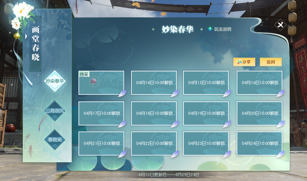 4月13日至4月24日,每天10:00都将解锁一个新的采风点图片。并在最初仅会展示一小块区域,每隔一小时逐步扩大显示范围,到当天18:00时将完整显示采风位置的图片并开启寻路功能。