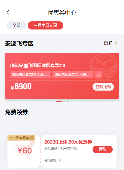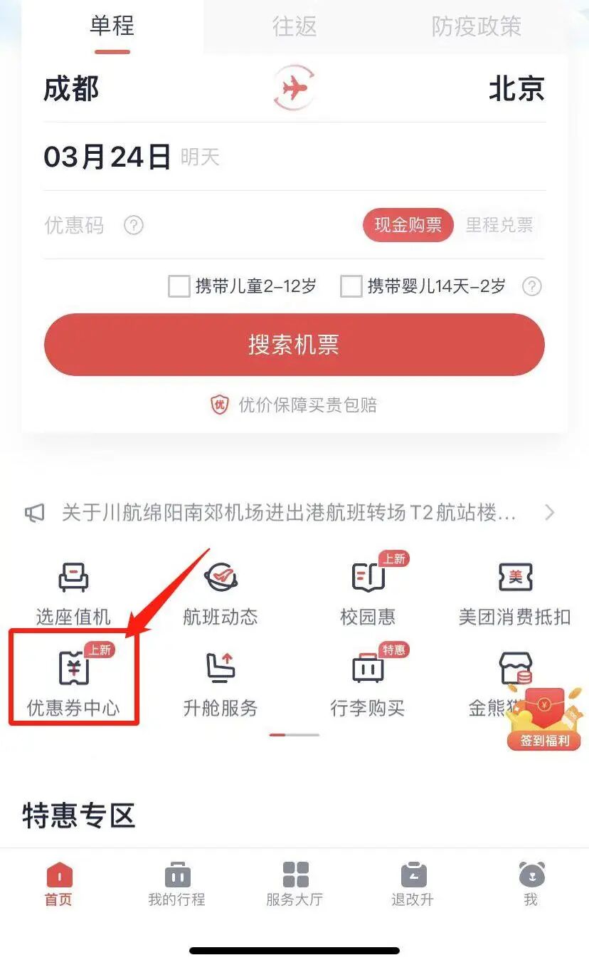 一、会员生日本月打开四川航空APP/微信小程序首页,点击优惠券中心。