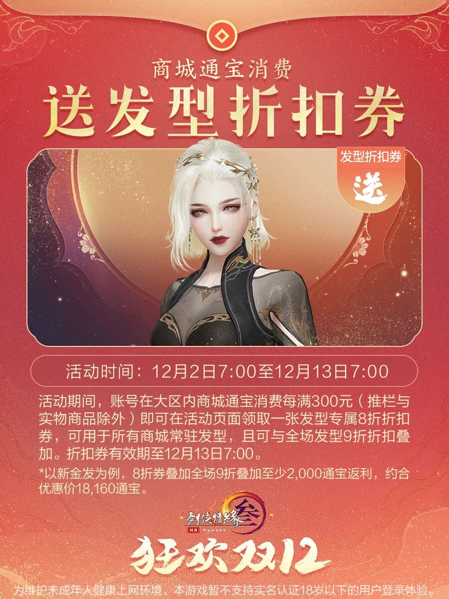 12月2日7:00起永久上架,售价28,000通宝,为绑定款,可享受“狂欢双十二”特惠福利,可使用折扣券。