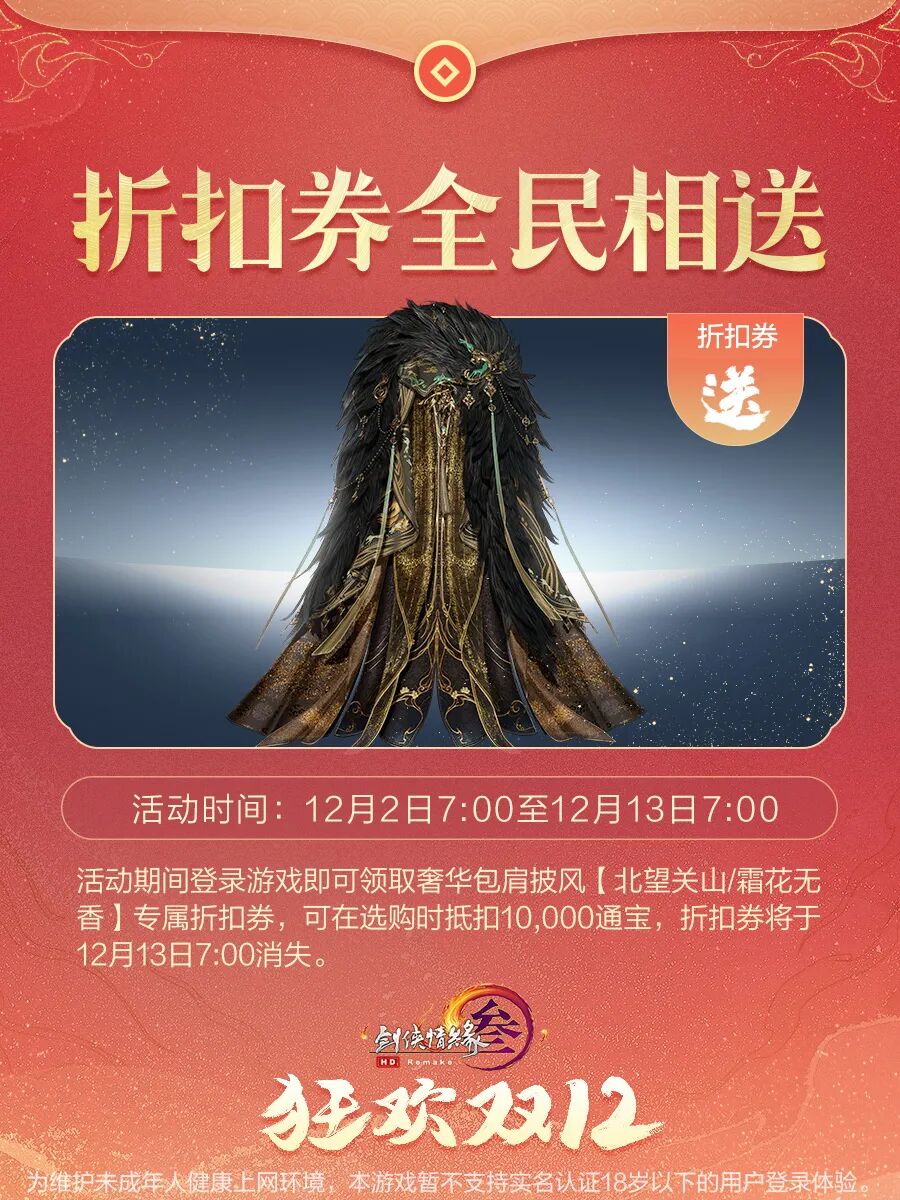 12月2日7:00起永久上架,售价10,000通宝。12月2日7:00至12月13日7:00限时8折,折后价8,000通宝,为不绑定款,不可使用折扣券。12月13日7:00后恢复原价,为绑定款,可使用折扣券。