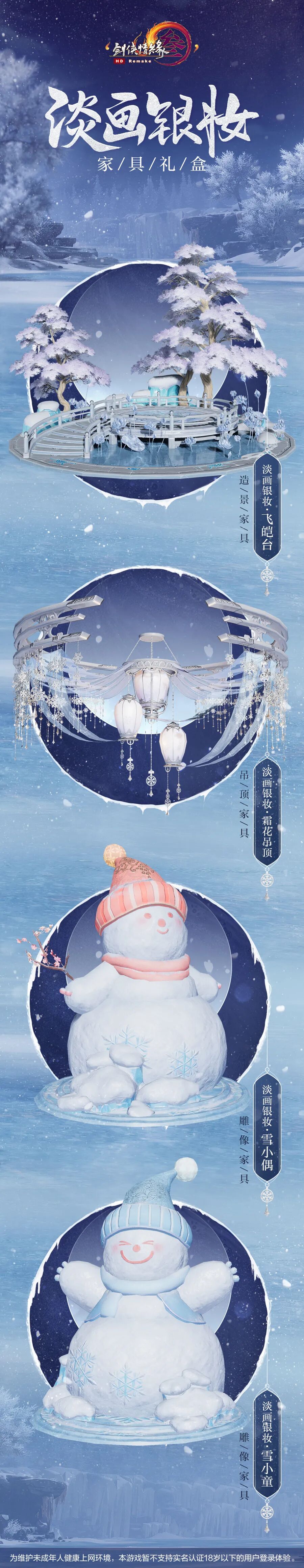 礼盒内含(造景家具·淡画银妆·飞皑台、吊顶家具·淡画银妆·霜花吊顶、雕像家具·淡画银妆·雪小偶、雕像家具·淡画银妆·雪小童各一件)