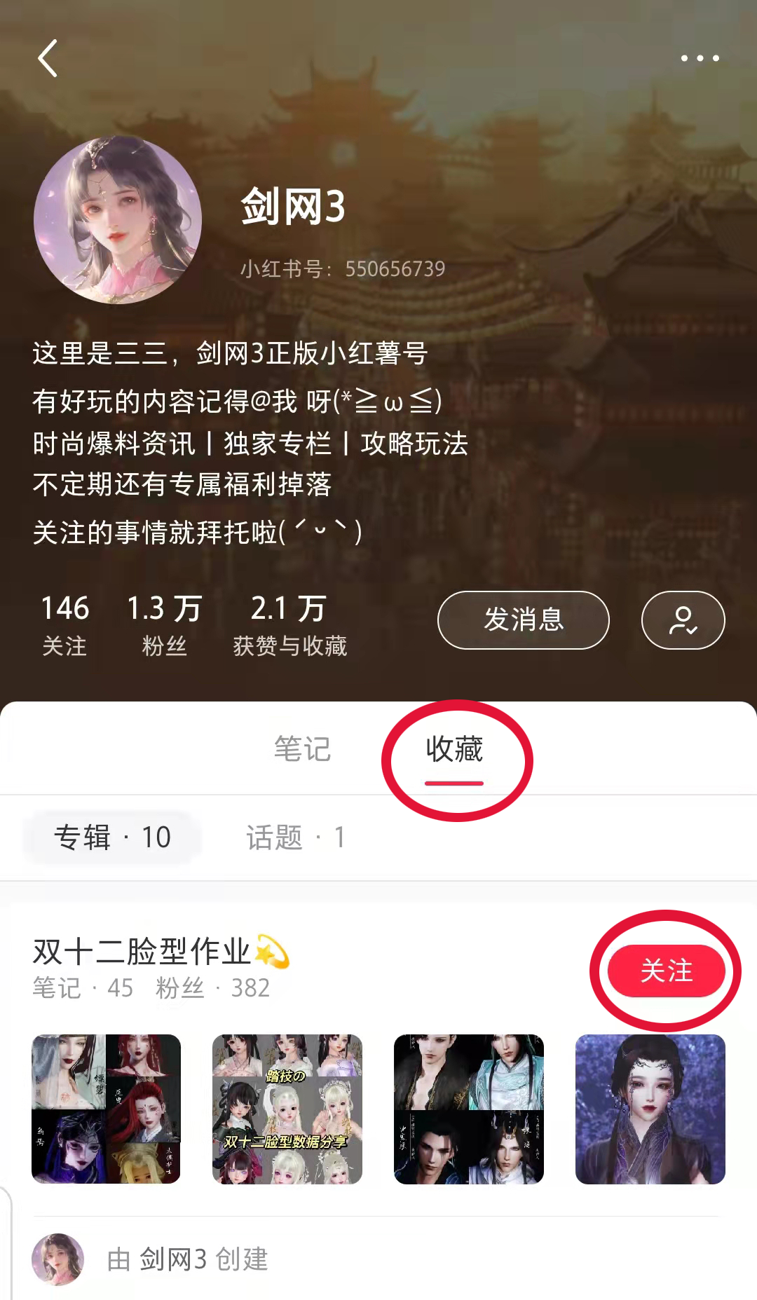 前往剑网3官方小红书账号收藏页面,点击一键收藏双十二所有脸型作业(还会持续更新哦~