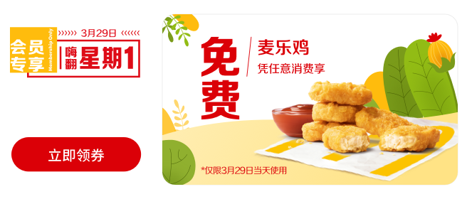 上述产品推广日期自2021年3月24日至2021年4月20日仅在中国(本活动场景下不包括港澳台地区)部分麦当劳餐厅售卖,机场、火车站等交通枢纽餐厅、旅游景区餐厅等特殊餐厅除外,具体以餐厅公示为准。仅限早餐时段后供应,早餐时段以餐厅实际情况为准,至上午10:30结束。通过麦乐送送餐服务、麦当劳APP、微信小程序、自助点餐机、第三方外送平台等渠道点餐的,优惠活动参与情况以各自渠道的图示宣传为准。
