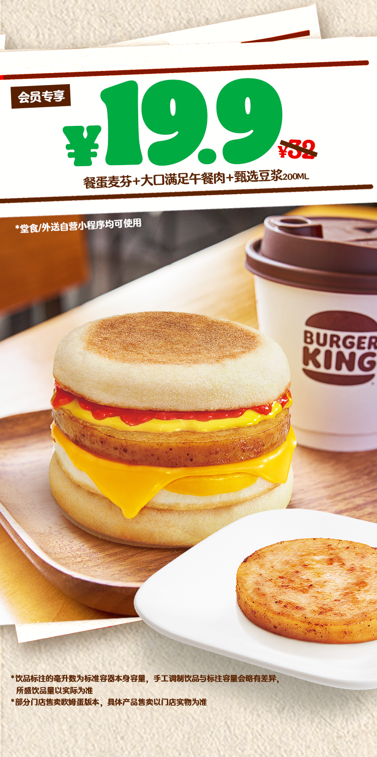 *非外卖渠道价格解释:图示如有划线价格,并非指原价,而是指不参加优惠活动情况下该产品在汉堡王指定门店销售的常规价格(或者指其中所含单品的常规单买价总和)或汉堡王门店建议零售价。除非图示另有解释,否则图示如有节省的金额或折扣比例,是与不参加优惠活动情况下在汉堡王指定门店单独购买该产品的常规价格(或者其中所含单品的常规单买价总和)或汉堡王门店建议零售价相比较。若需要查询当前门店销售的常规价格,可查看相应门店菜单或详询店员。