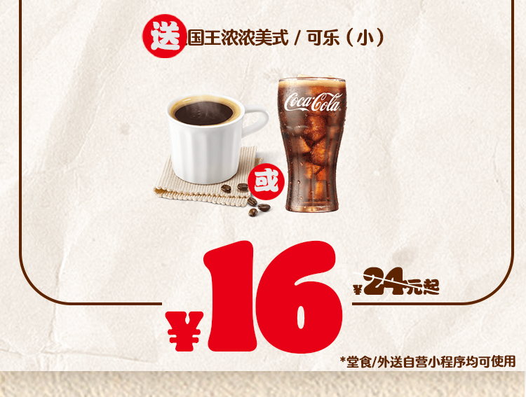 *外卖渠道价格解释:图示如有划线价格,并非指原价,而是指不参加优惠活动情况下该产品在汉堡王外送销售的常规价格(或者指其中所含单品的常规单买价总和)或汉堡王外送建议零售价。除非图示另有解释,否则图示如有节省的金额或折扣比例,是与不参加优惠活动情况下在汉堡王外送单独购买该产品的常规价格(或者其中所含单品的常规单买价总和)或汉堡王外送建议零售价相比较。
