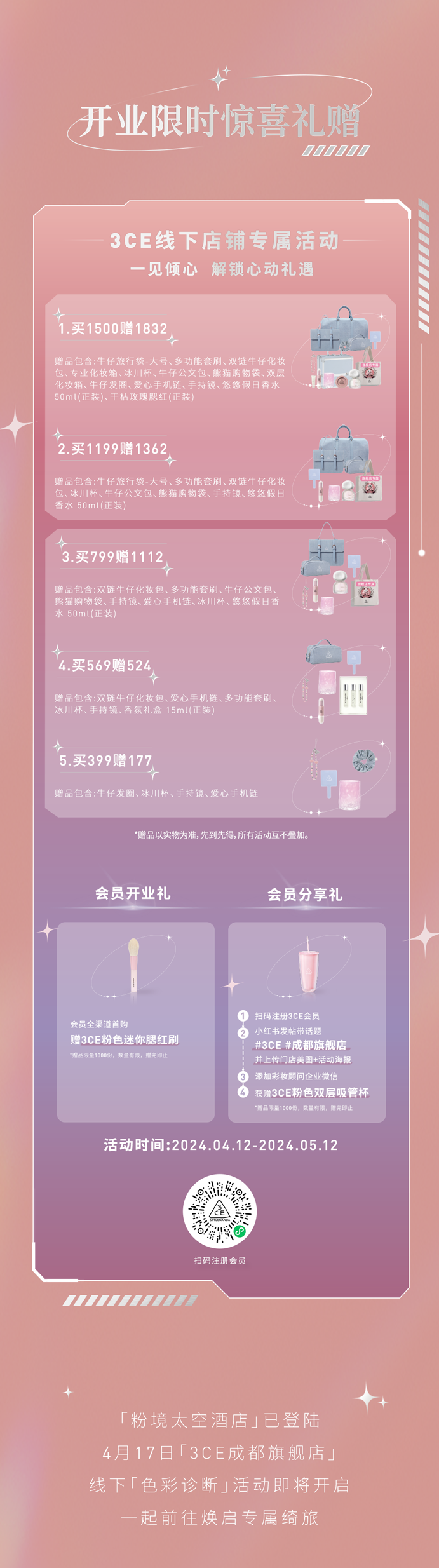 推荐:「点击消失后展开」3CE品牌这个品牌的介绍,一一展示活动的具体规则、奖品设置、参与时间等信息,吸引读者参与活动并有机会获得奖品。