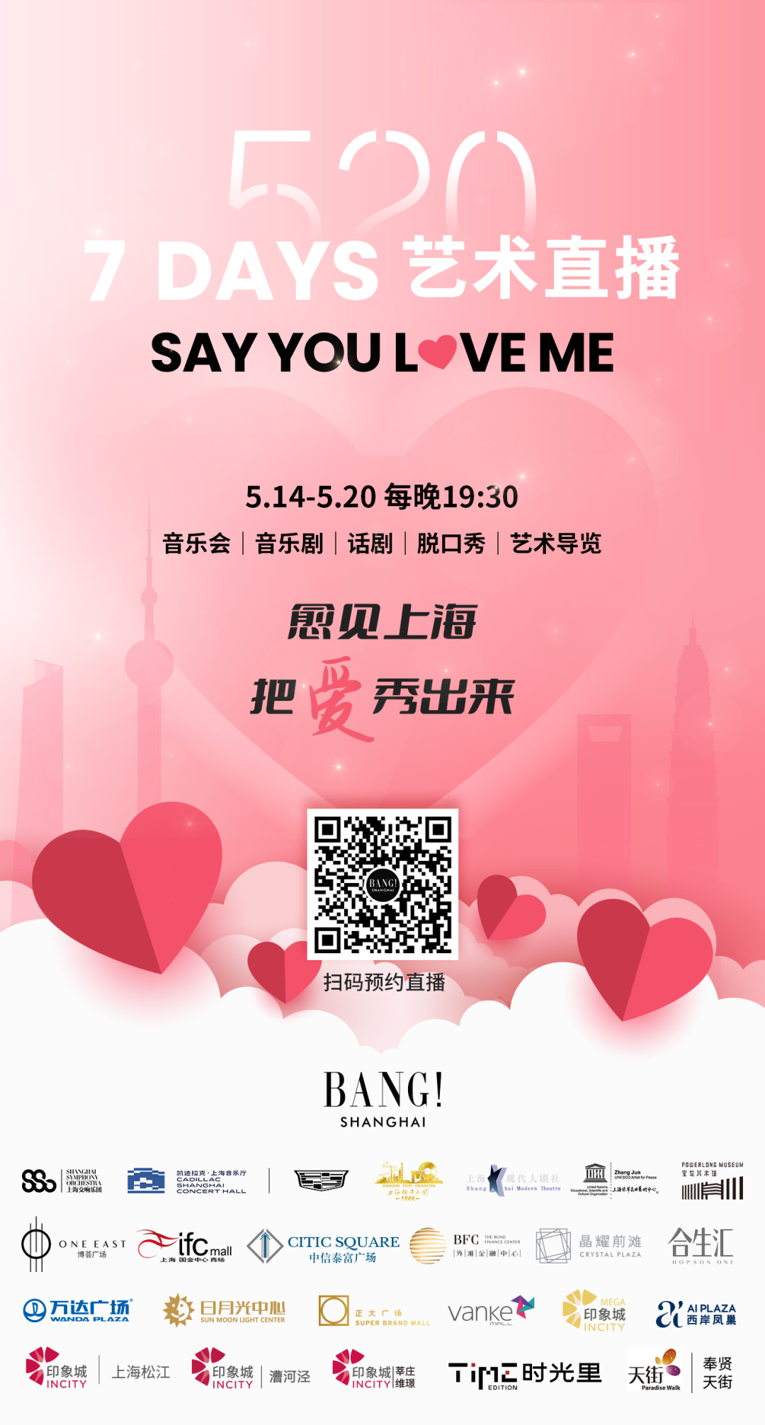 上海BANG与你相约云端,通过更多精彩纷呈的节目,带领大家一起把爱秀出来,“单身狗”可以在线寻找爱,甜蜜情侣可以一起秀恩爱!用爱疗愈自我、疗愈上海!