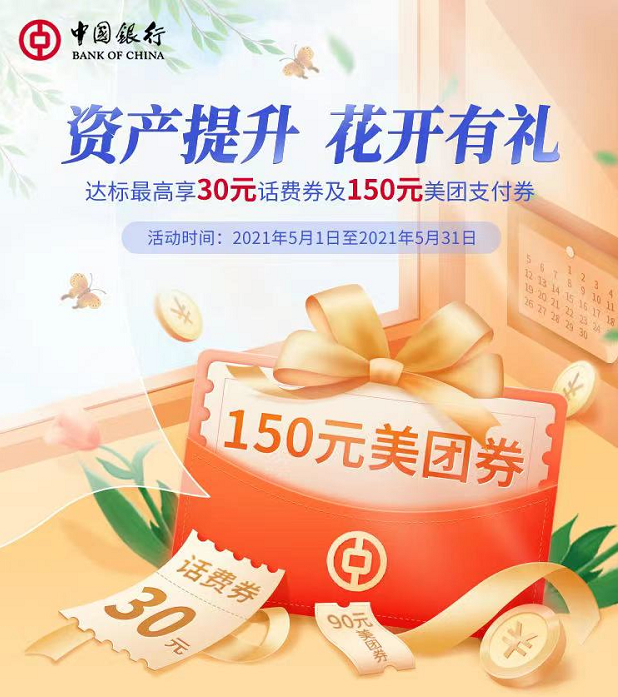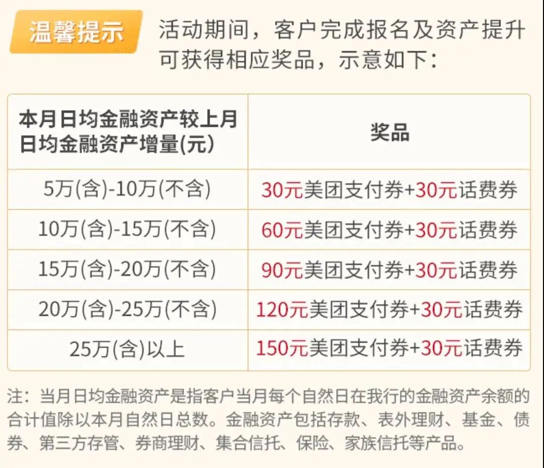 完成活动报名后,当月日均金融资产较上月提升5万元,即有机会获得30元美团支付券+30元话费券,在此基础上当月日均金融资产每再提升5万元,可有机会额外再获得30元美团支付券,美团支付券最高可累计获得150元。