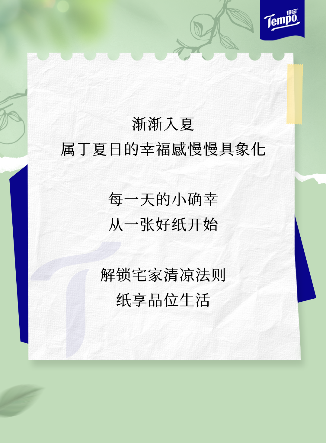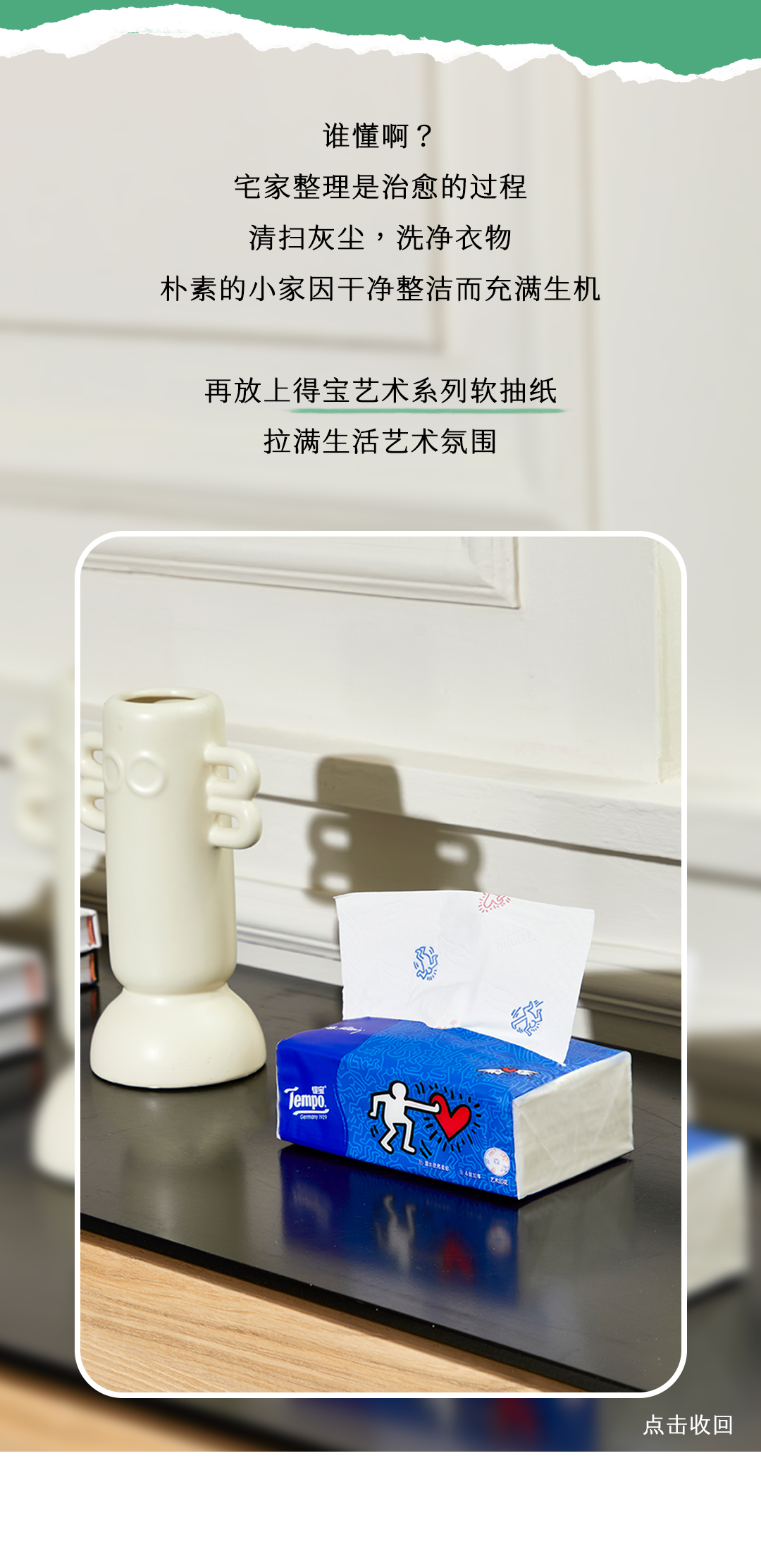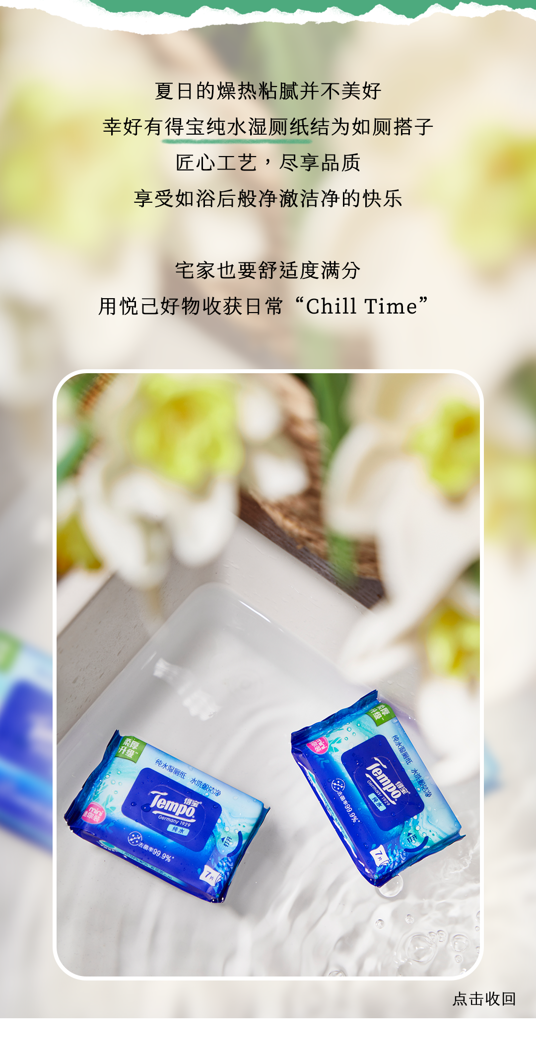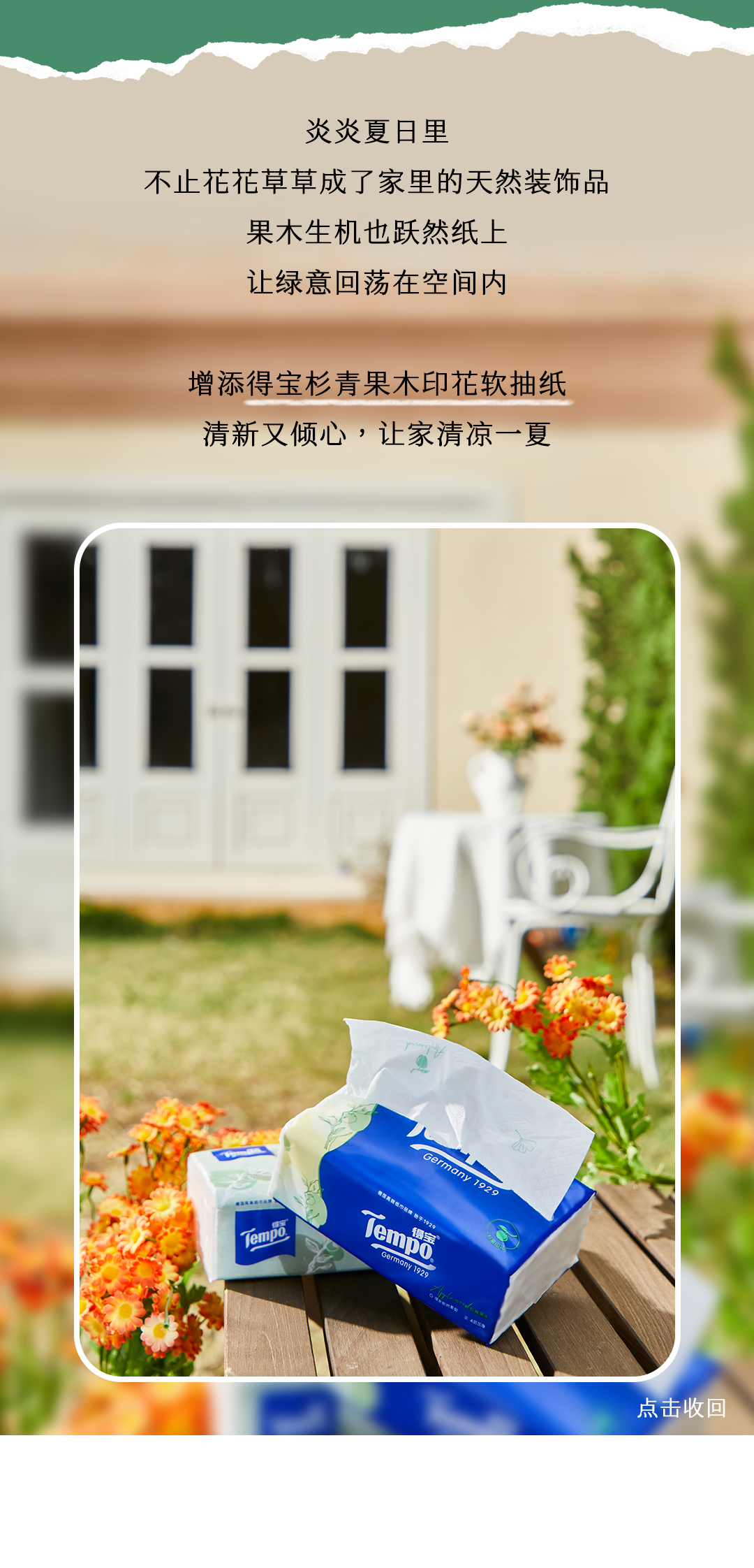 推荐:多个平级「点击切换展开,点击收回」介绍夏日宅家纸巾好物集结,借此宣传Tempo 得宝 X618 优惠福利。